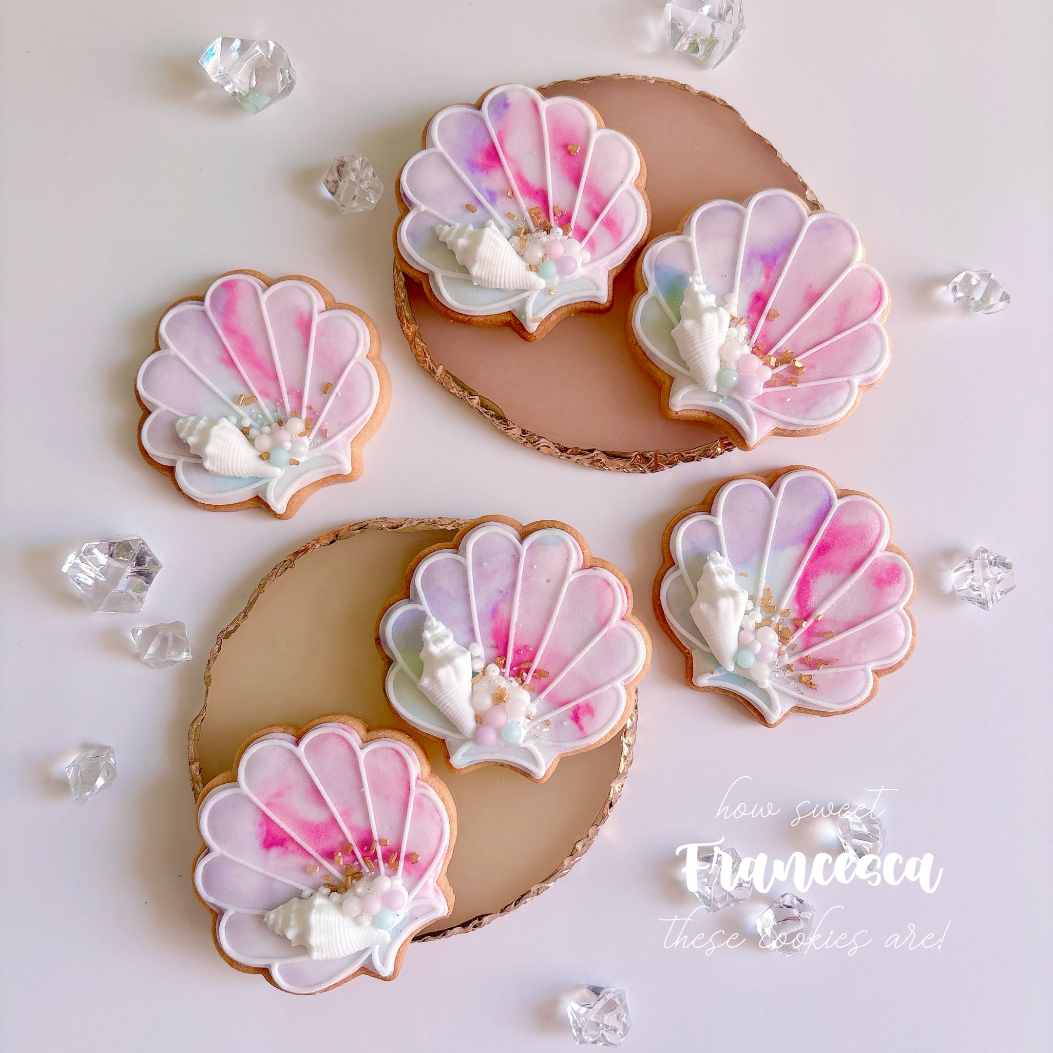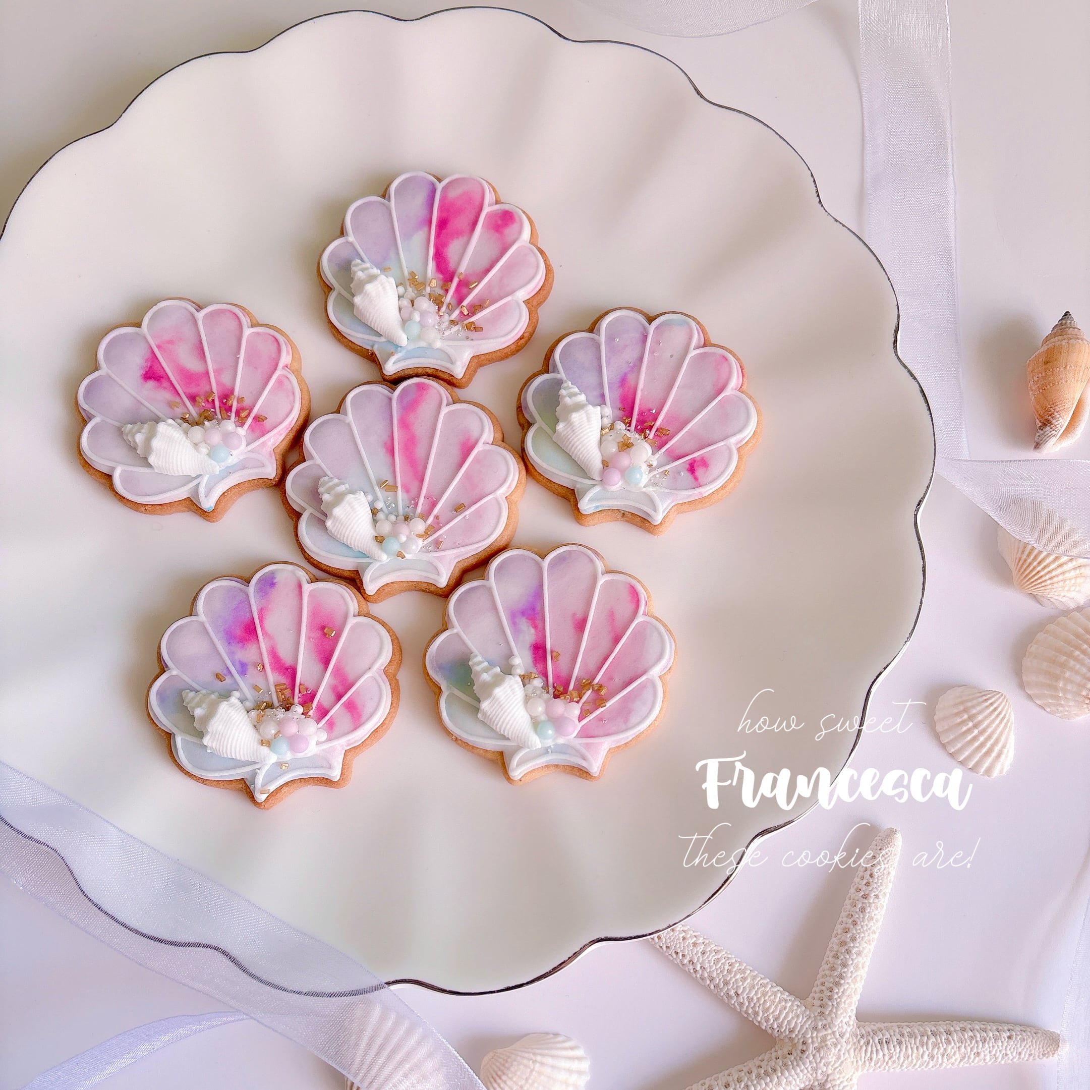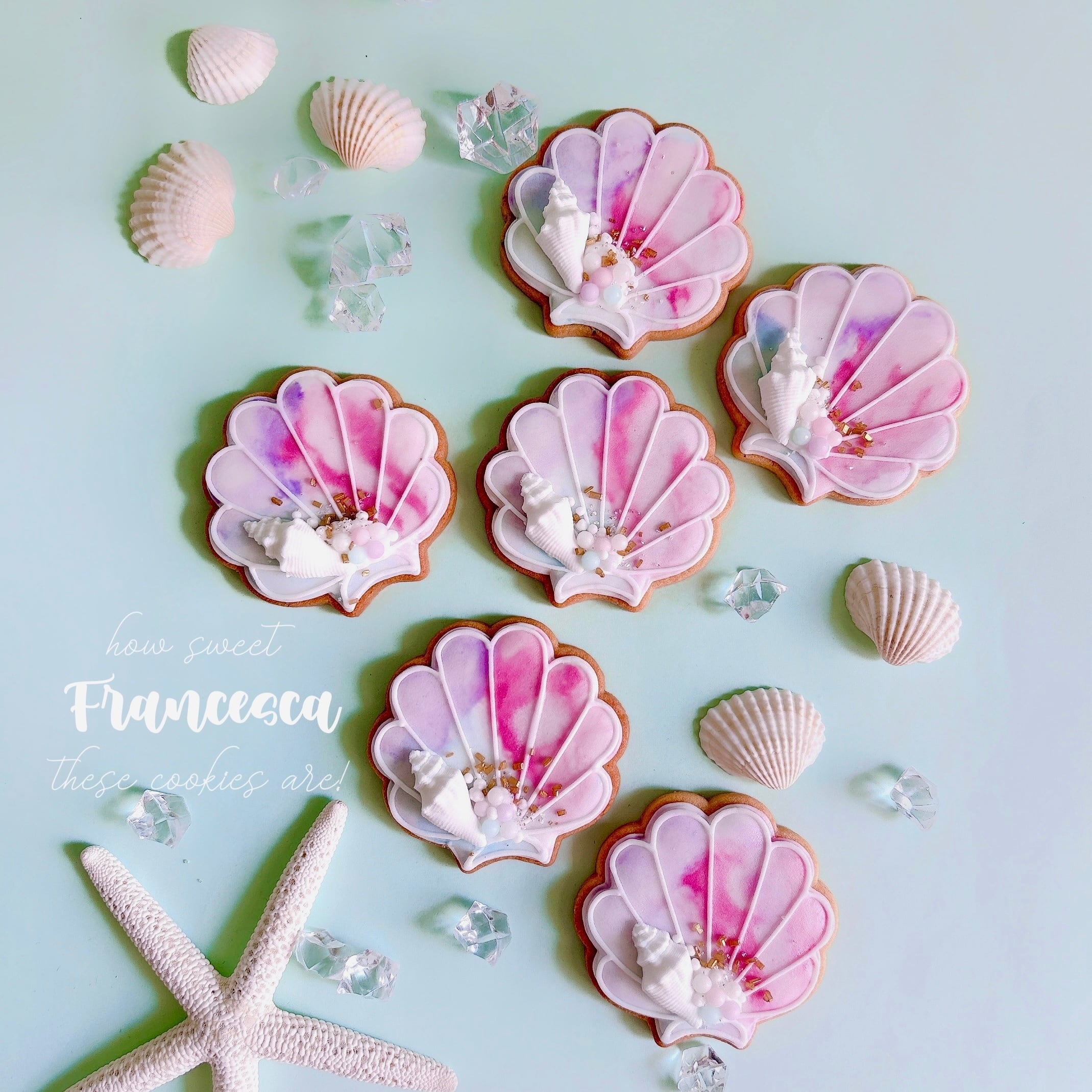 マーメイド風のマーブルカラーが涼しげでかわいらしいシェルのアイシングクッキー。