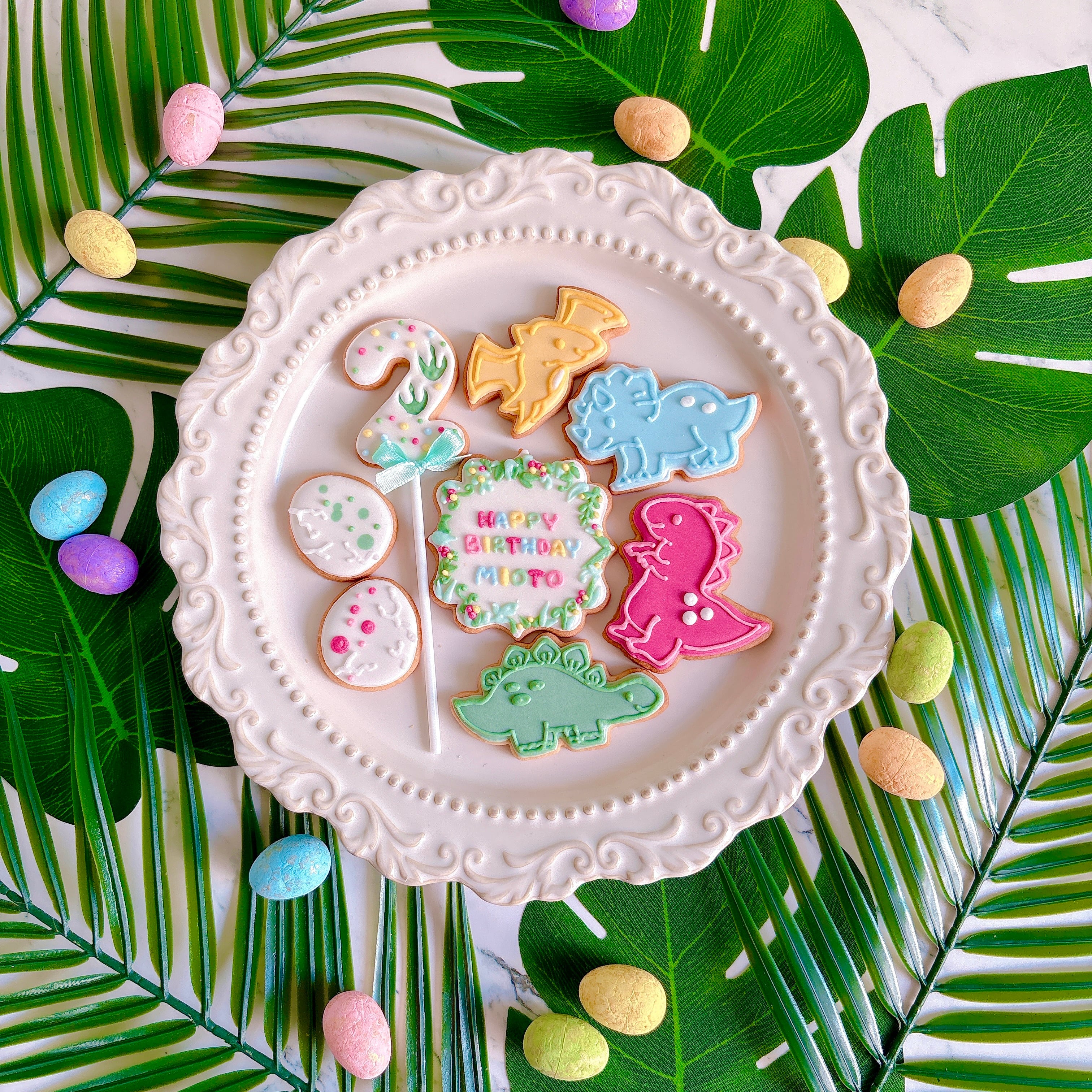 恐竜をテーマにした、文字入れのできるアイシングクッキーギフトセット"COLORFUL DINOSAUR"。
