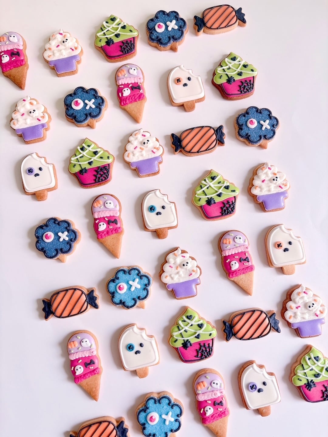 詰め合わせのアイスクリーム・シャーベット・カップケーキ・ソフトクリーム・わたあめ・キャンディをよく見ると、ガイコツや目玉、クモなどのハロウィンらしいスプリンクルが入っています。
