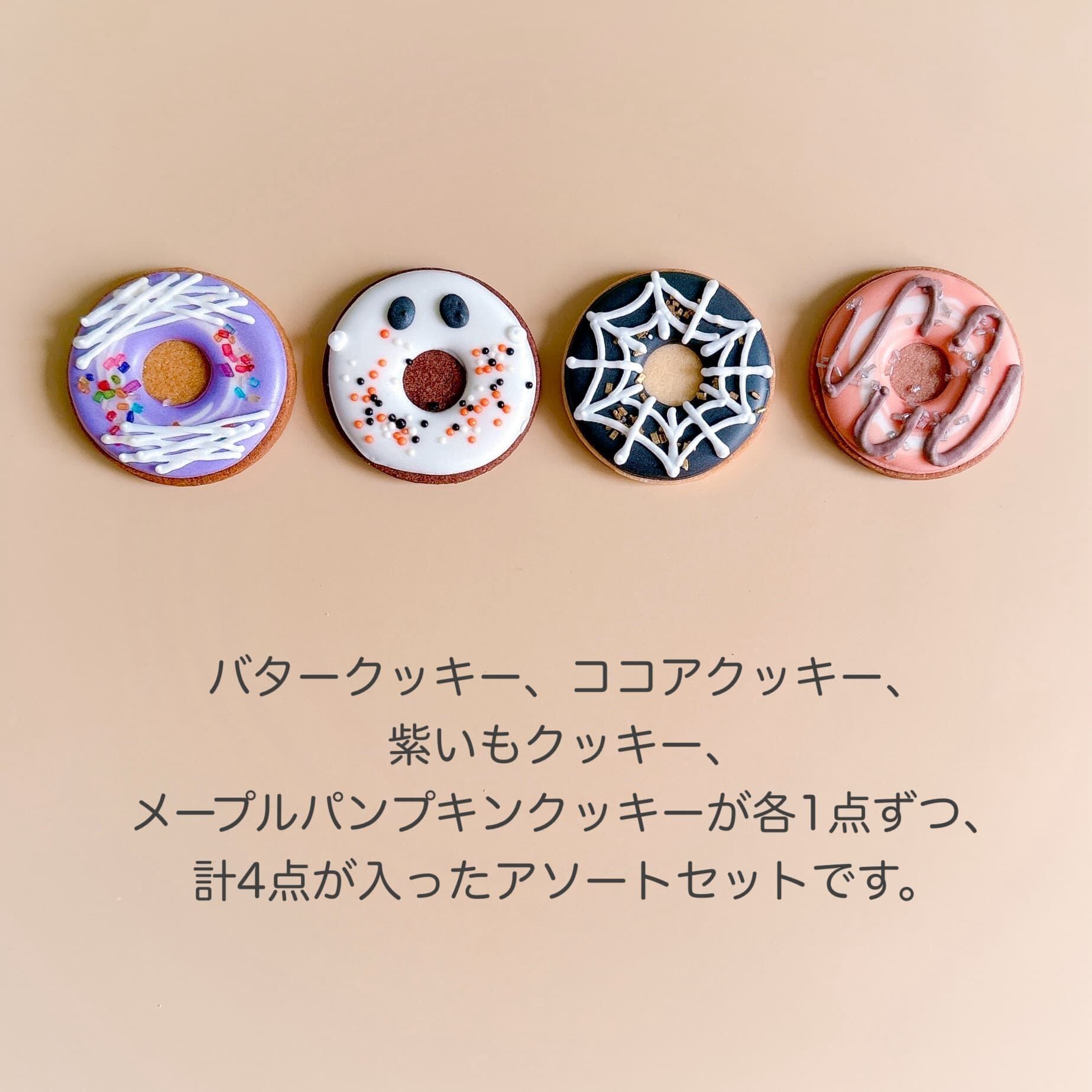 クッキー生地はバタークッキー、ココアクッキー、メープルパンプキンクッキー、紫いもクッキーが各1枚ずつ、合計4枚が入ったアソートセットです。
