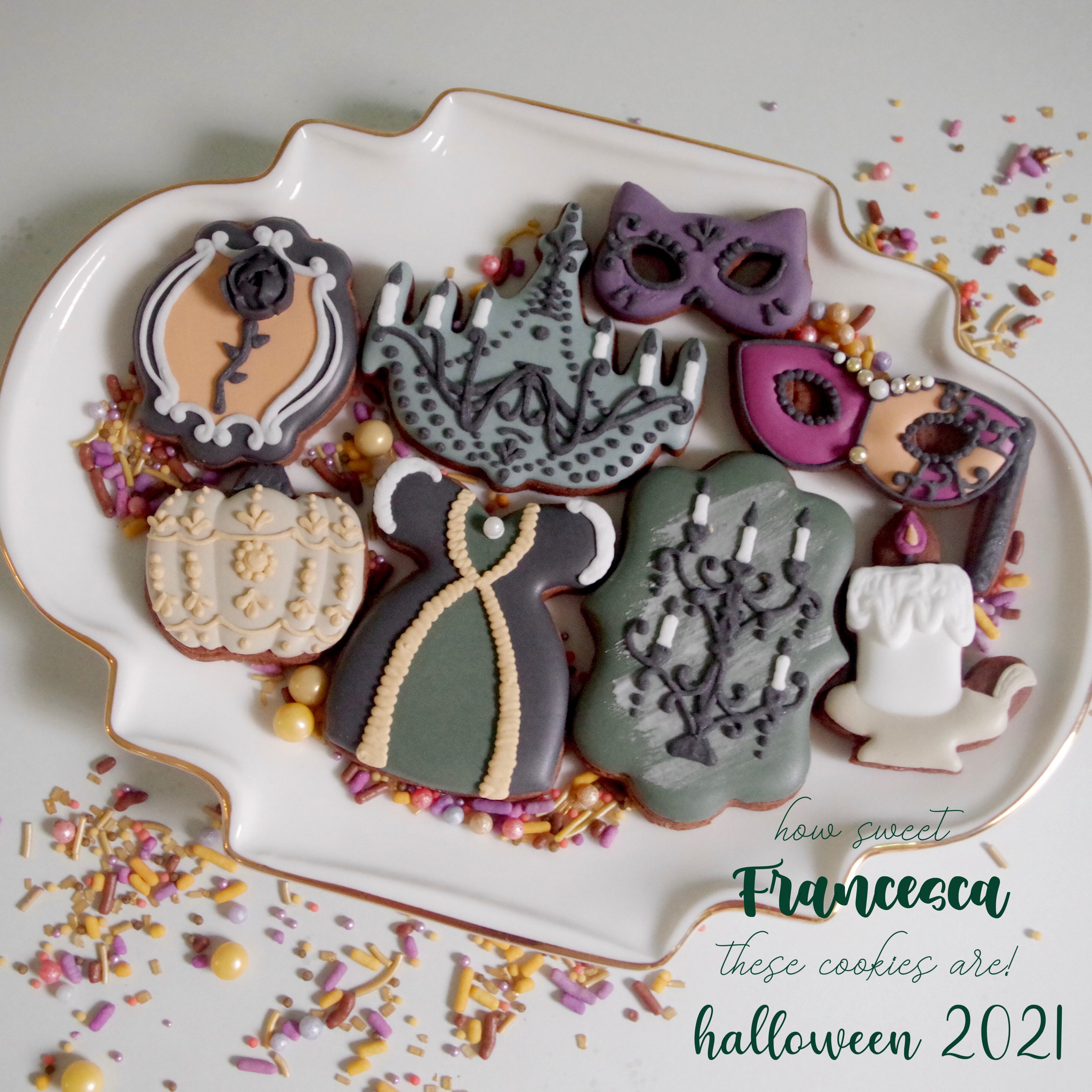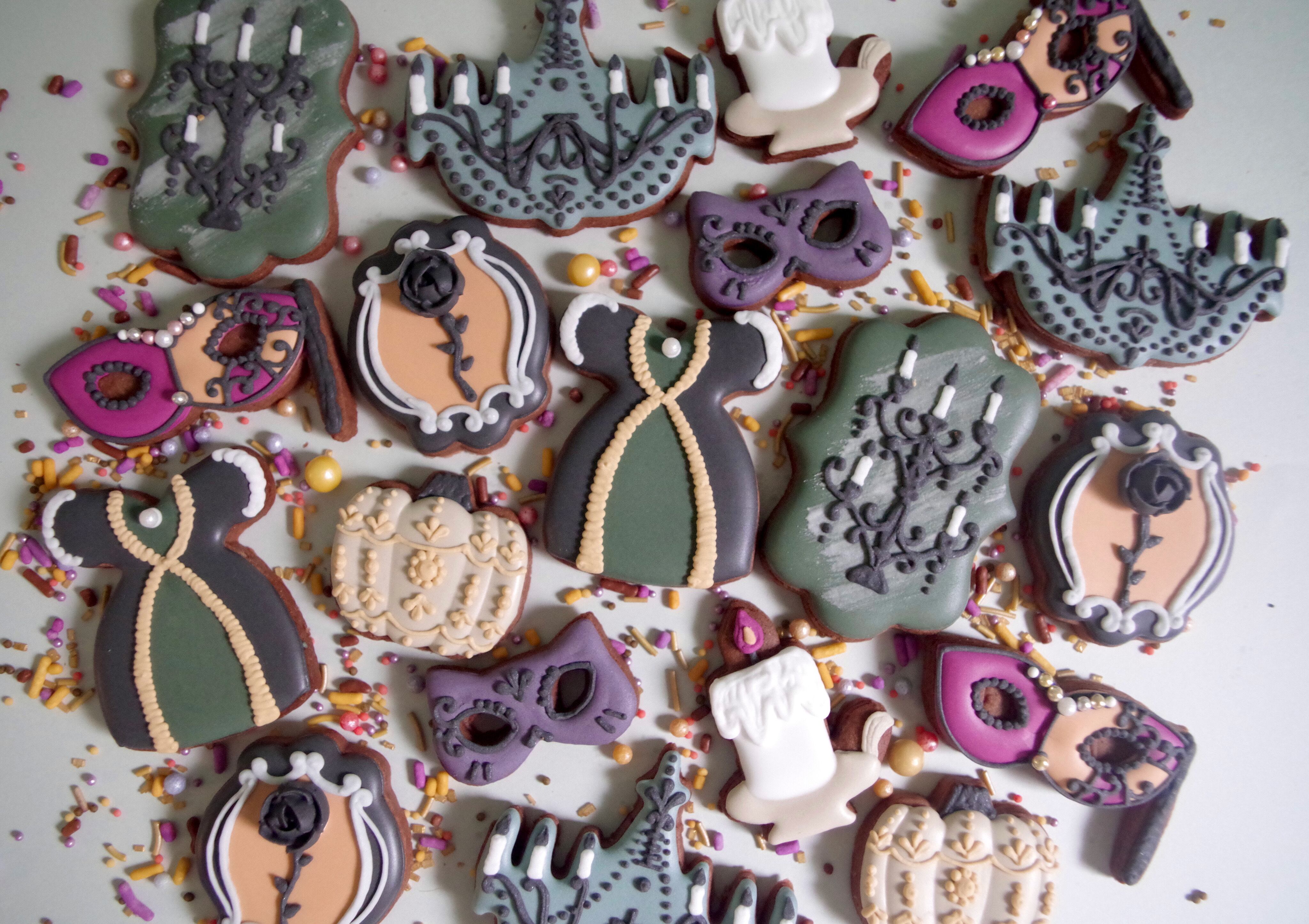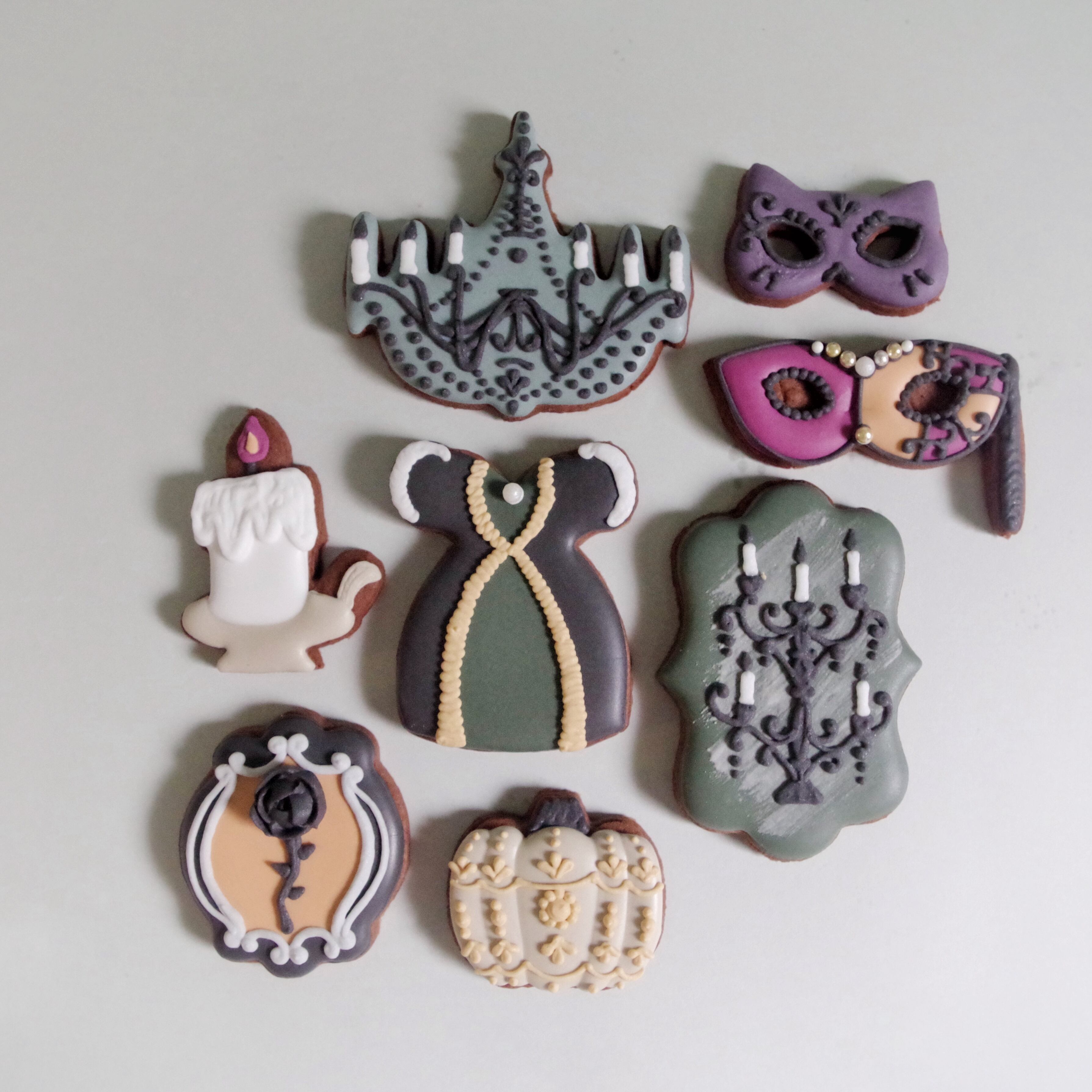 ゴシックなドレス、シャンデリア、キャンドルスタンド、ロウソク、猫マスク、ベネチアンマスク、かぼちゃ、黒バラをイメージしたアイシングクッキーセットです。