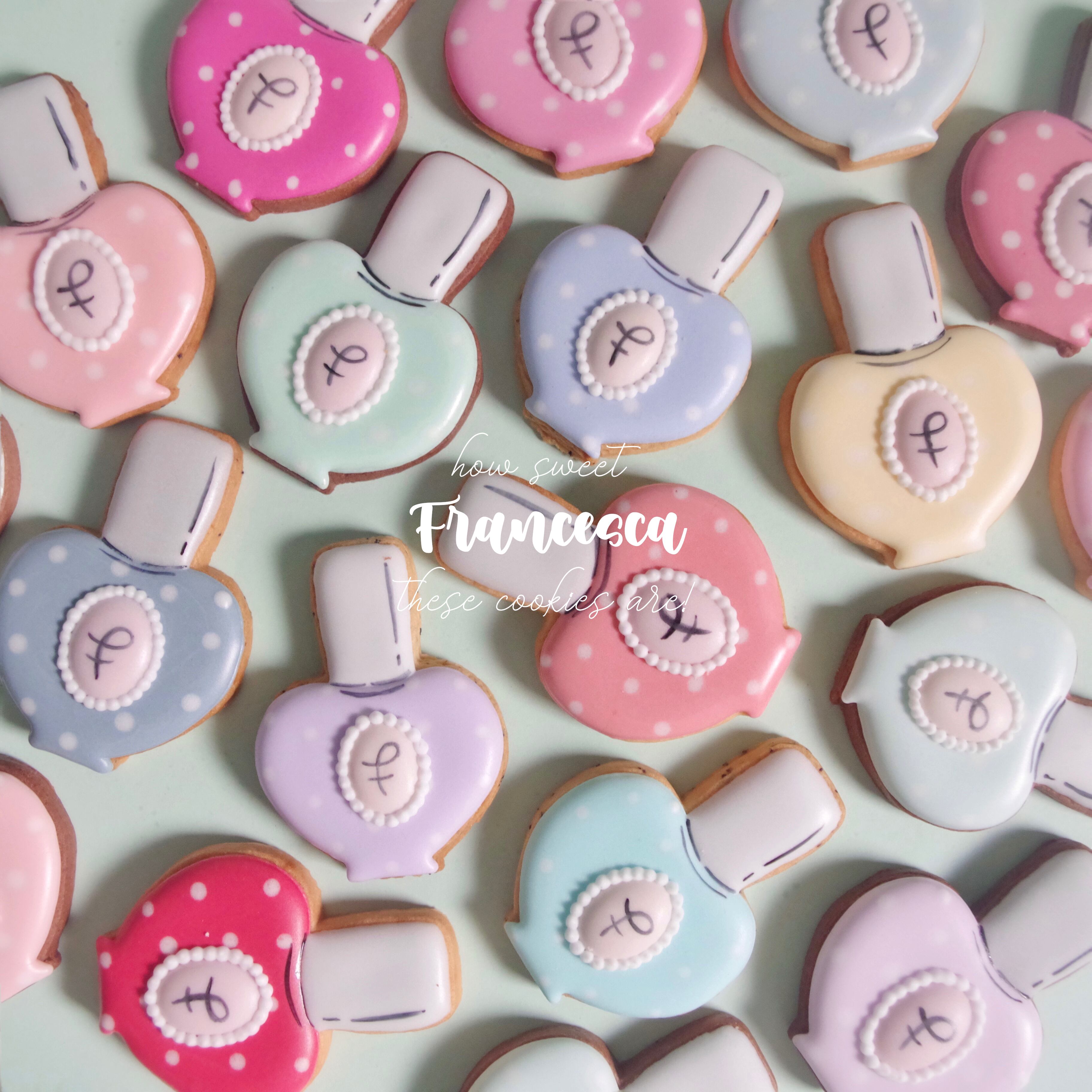 Francesca von Sweetsの「F」がトレードマークの、マニキュアボトルをイメージしたアイシングクッキーセットです。