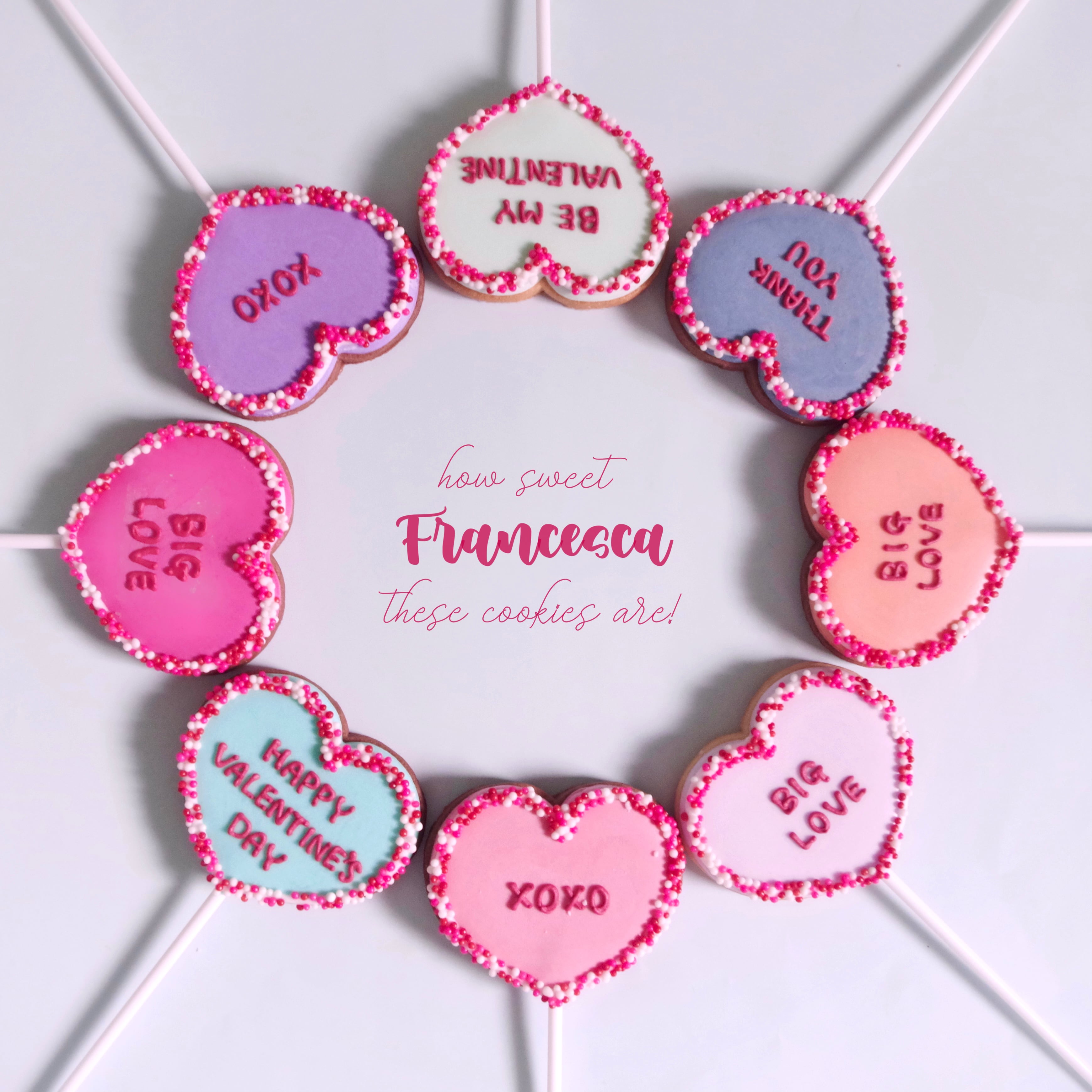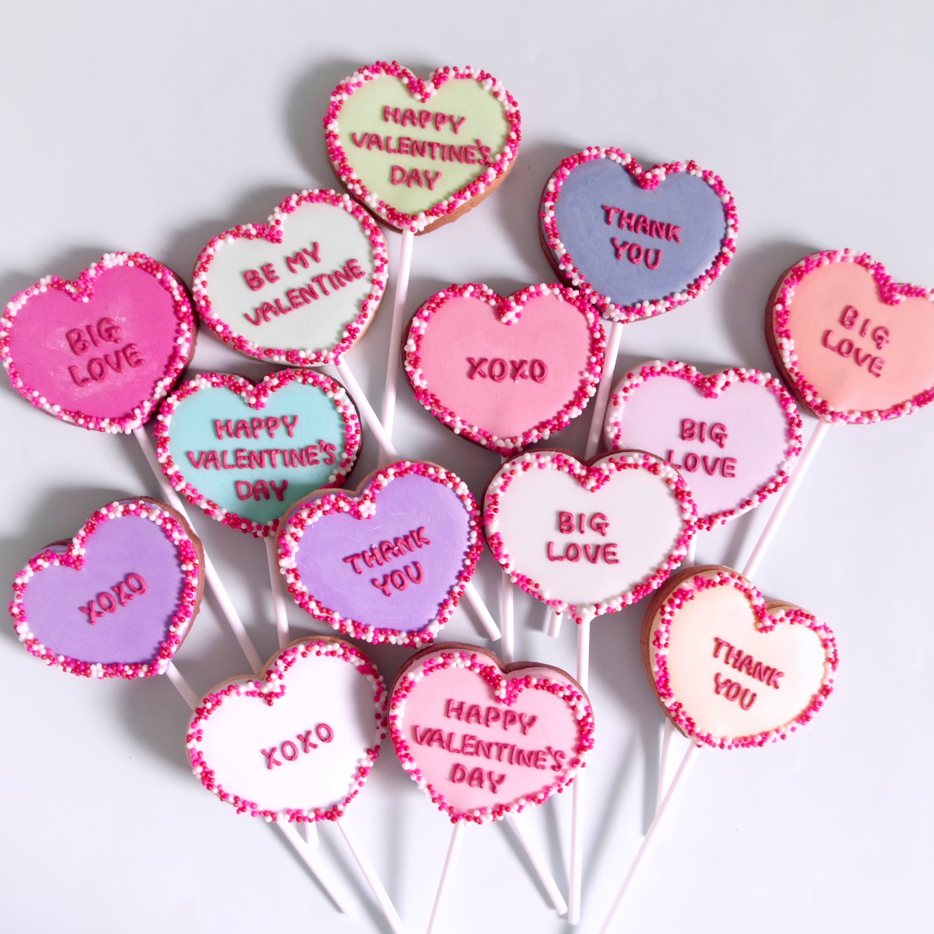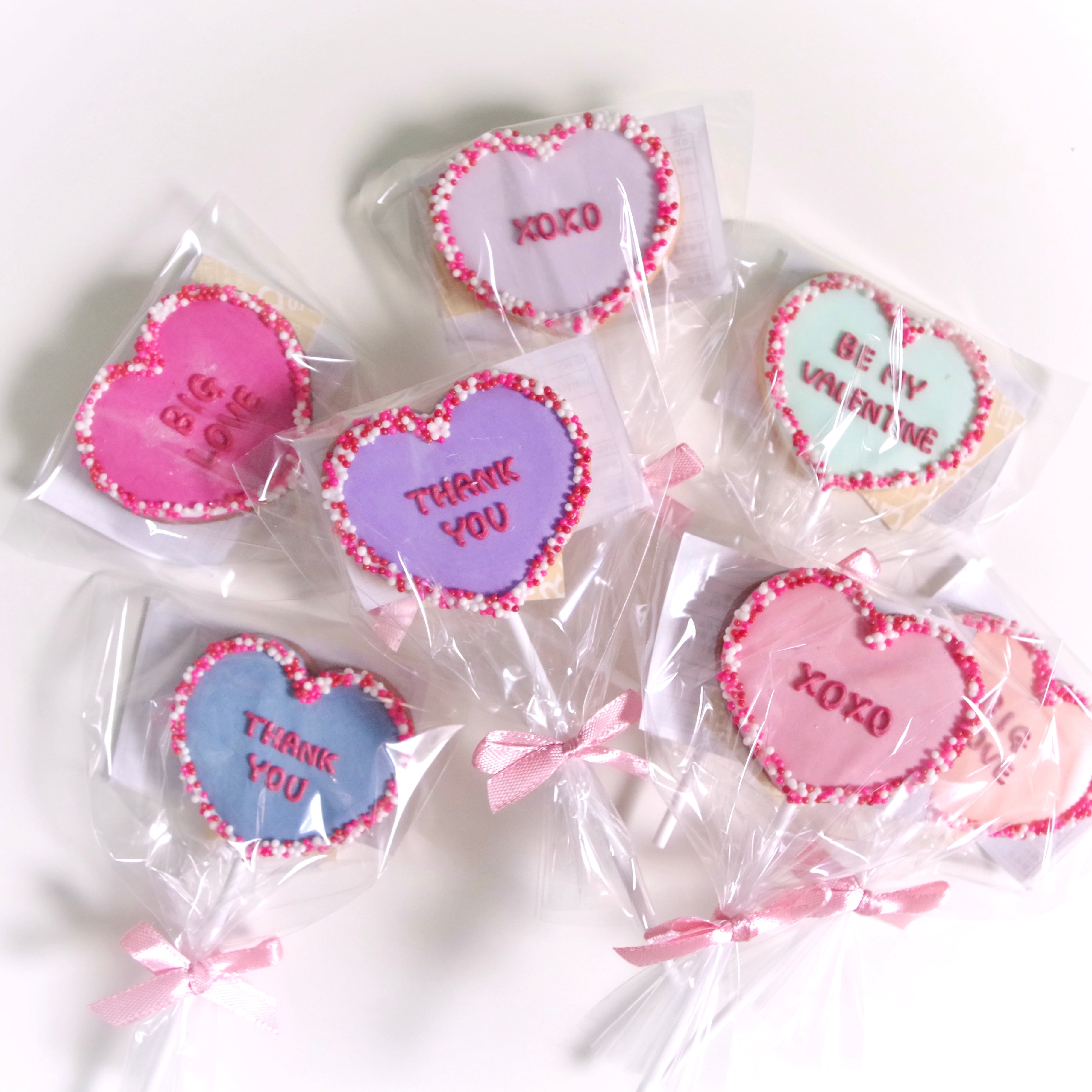 ポップス付きで配りやすく食べやすい、カラフルなハート型アイシングクッキーです。