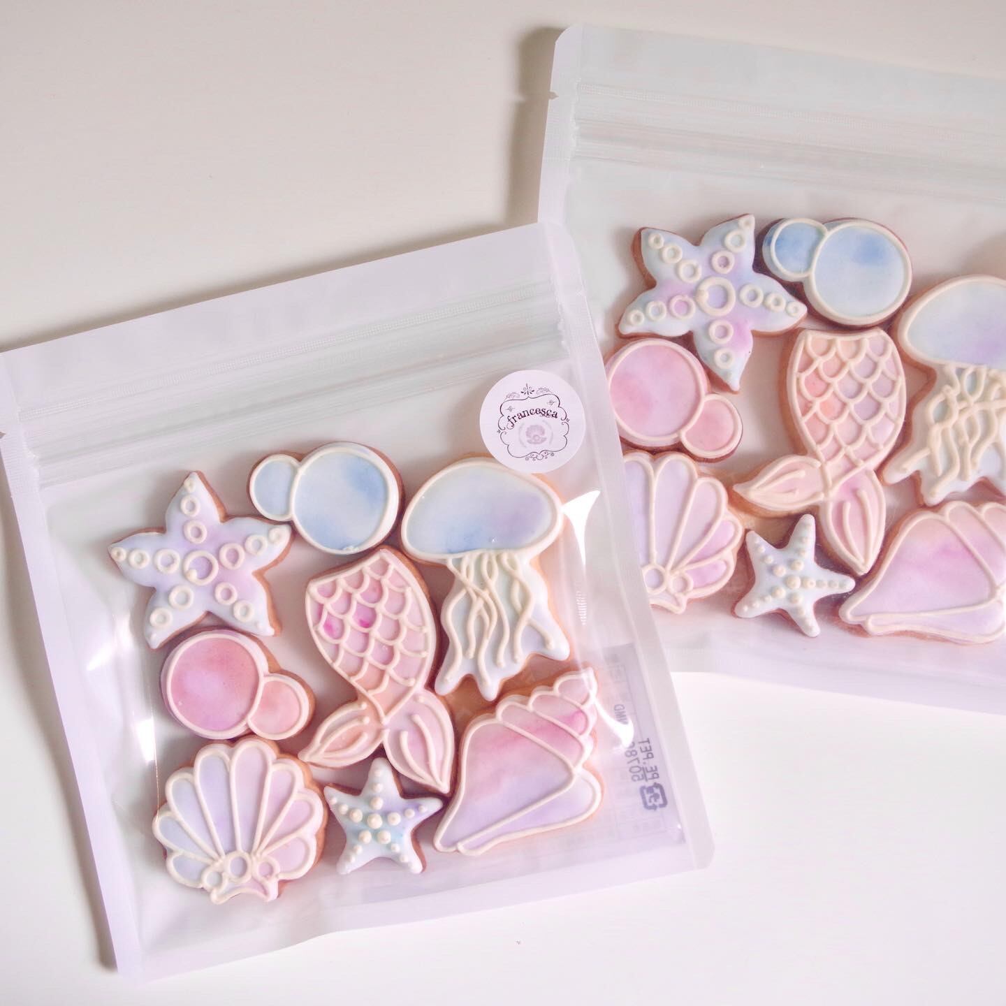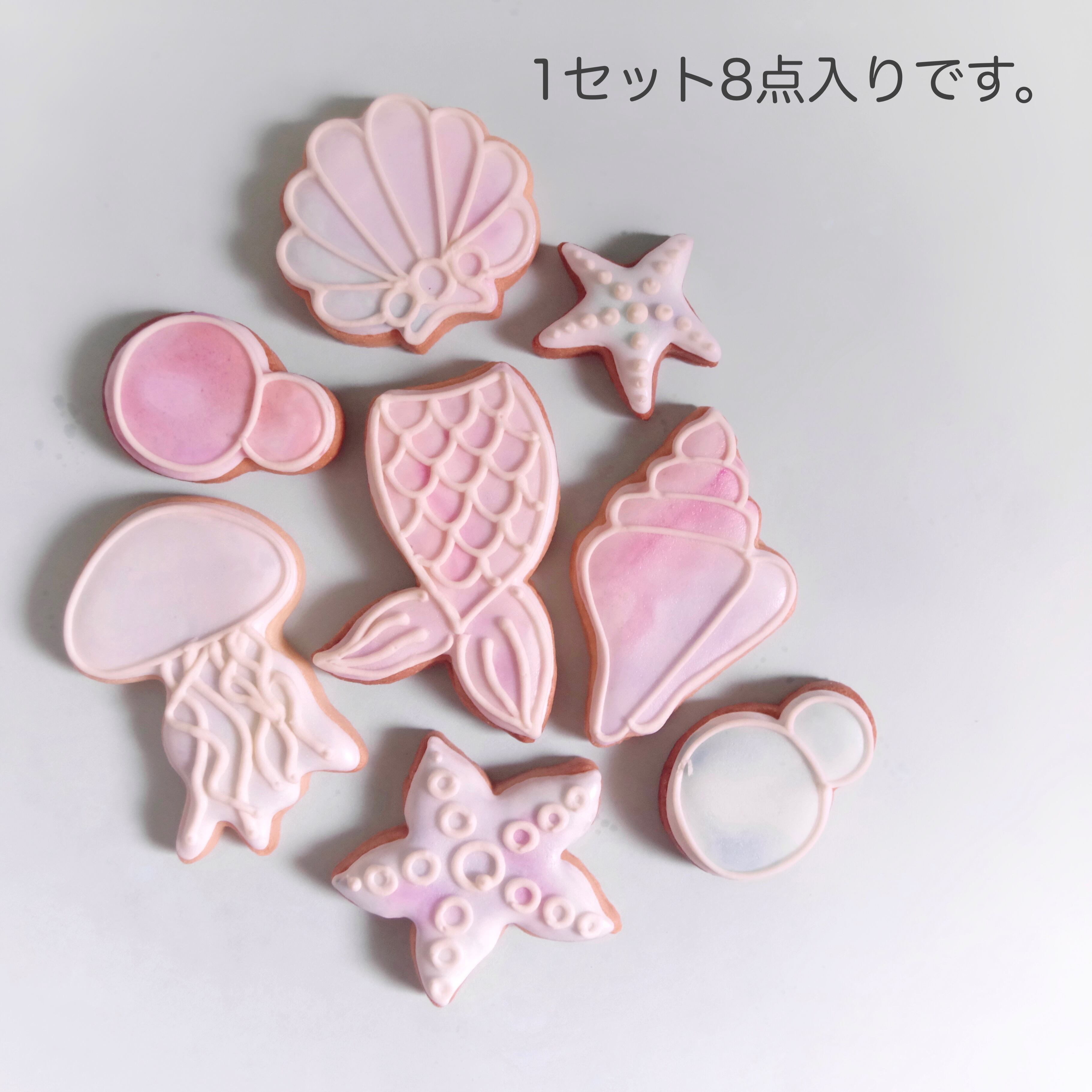 マーメイド、クラゲ、シェル、ヒトデ、泡などが合計8点入った、ウォーターカラーが爽やかでかわいいアイシングクッキーセットです。
