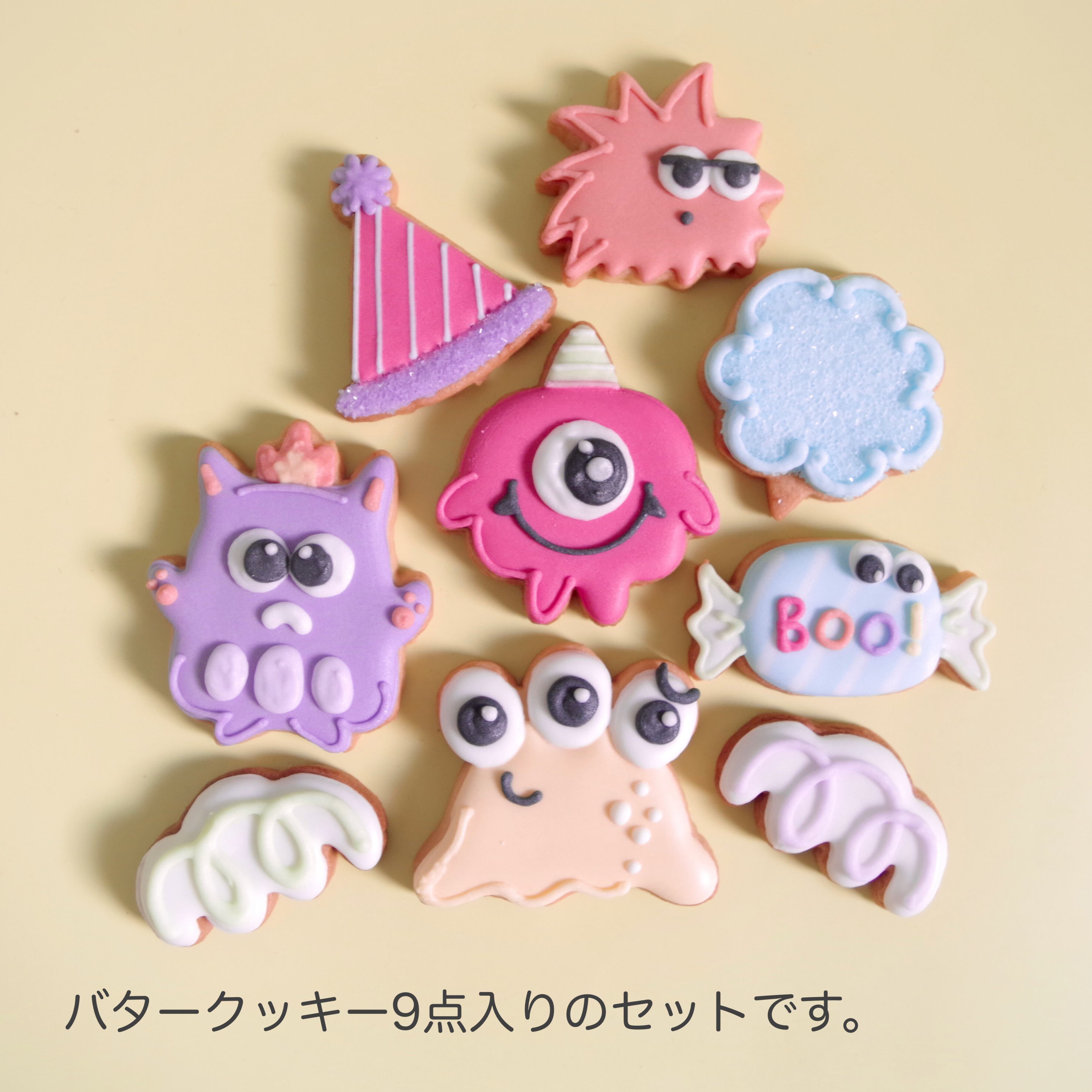 1つ目・2つ目・3つ目のモンスター3兄弟が開く、9点入りのかわいいハロウィンパーティアイシングクッキーセット。