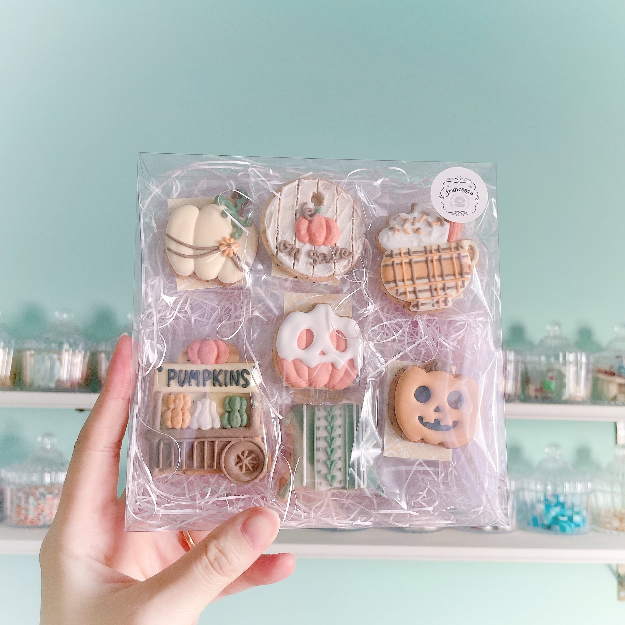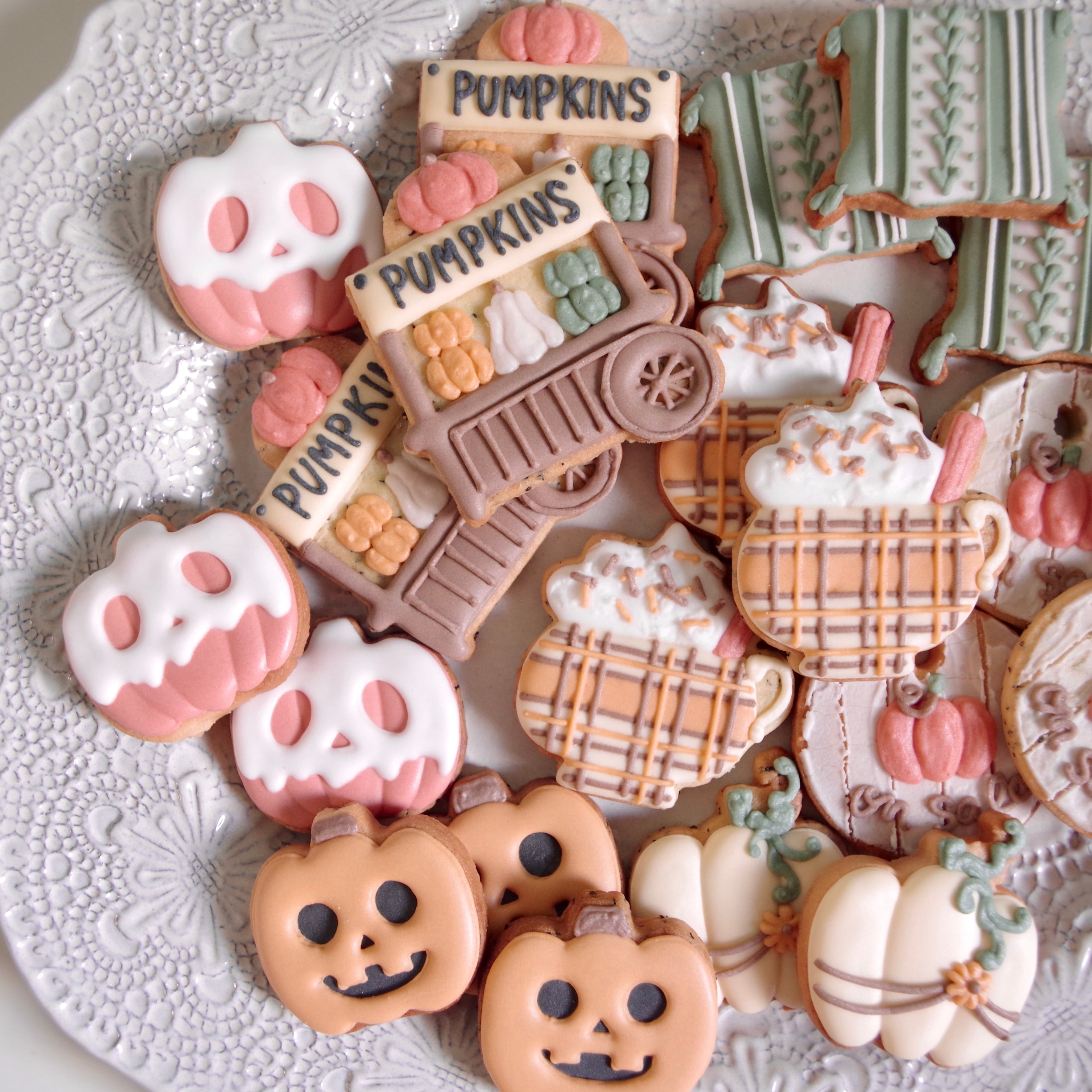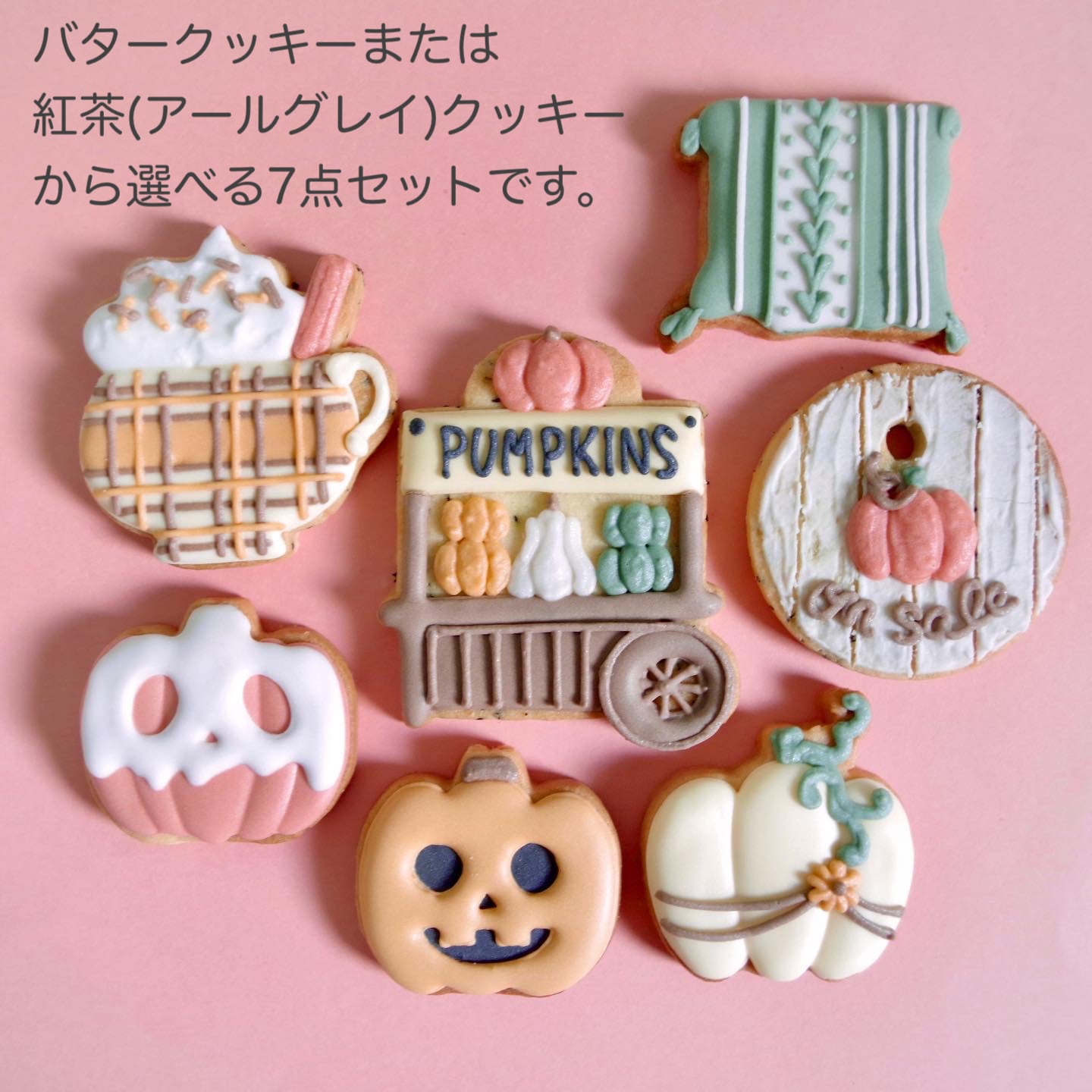 3種のかぼちゃ、パンプキンワゴン、クッション、パンプキンラテ、かぼちゃタグの7点が入ったかぼちゃが主役の秋らしいアイシングクッキーセットです。