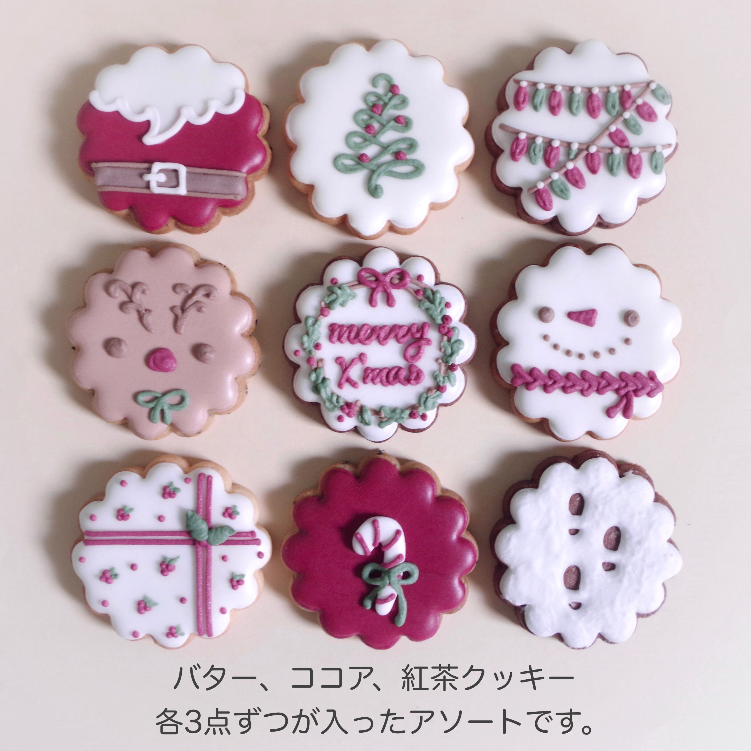 クッキー生地はバタークッキー・ココアクッキー・紅茶(アールグレイ)クッキーが各3点ずつ入った3種アソートになっています。