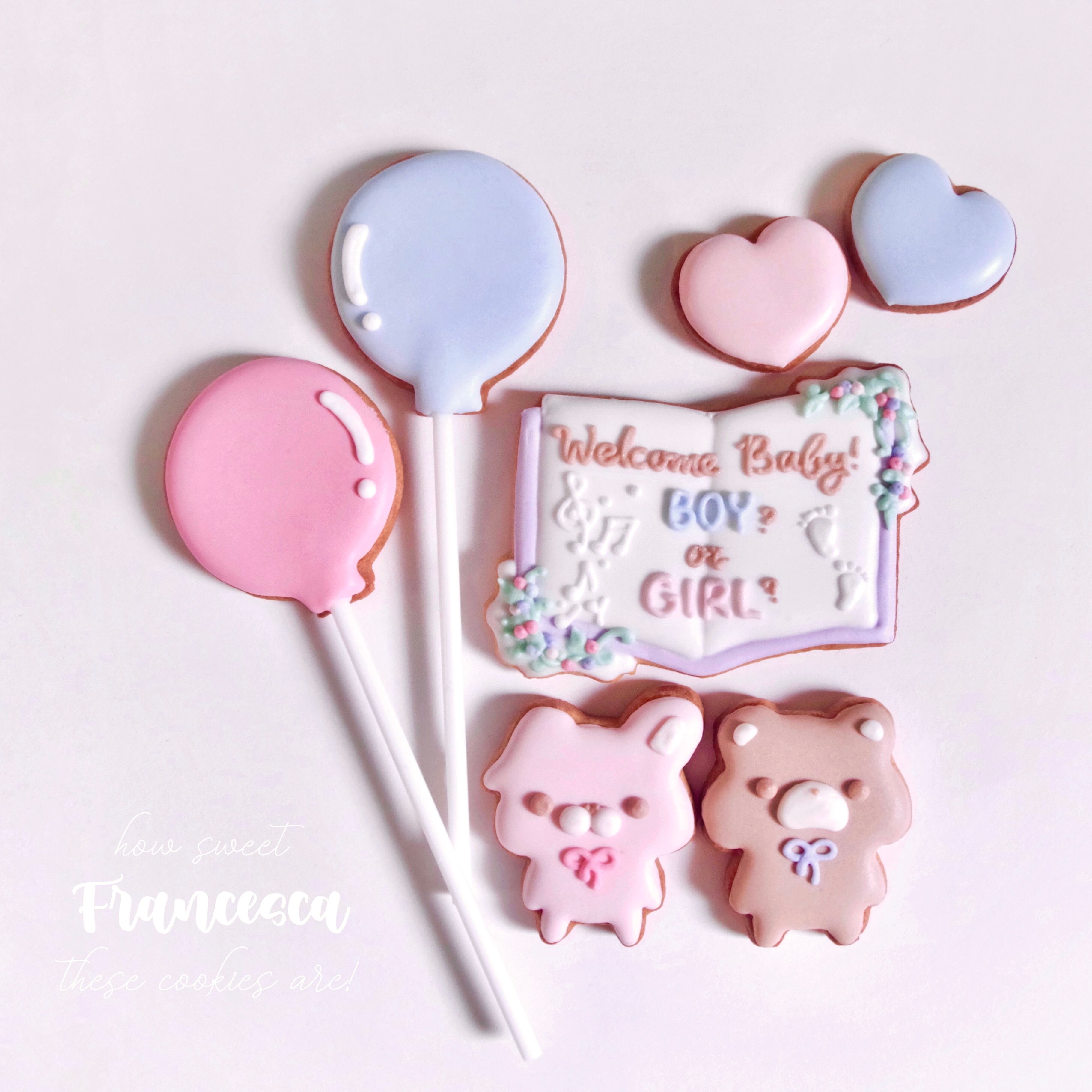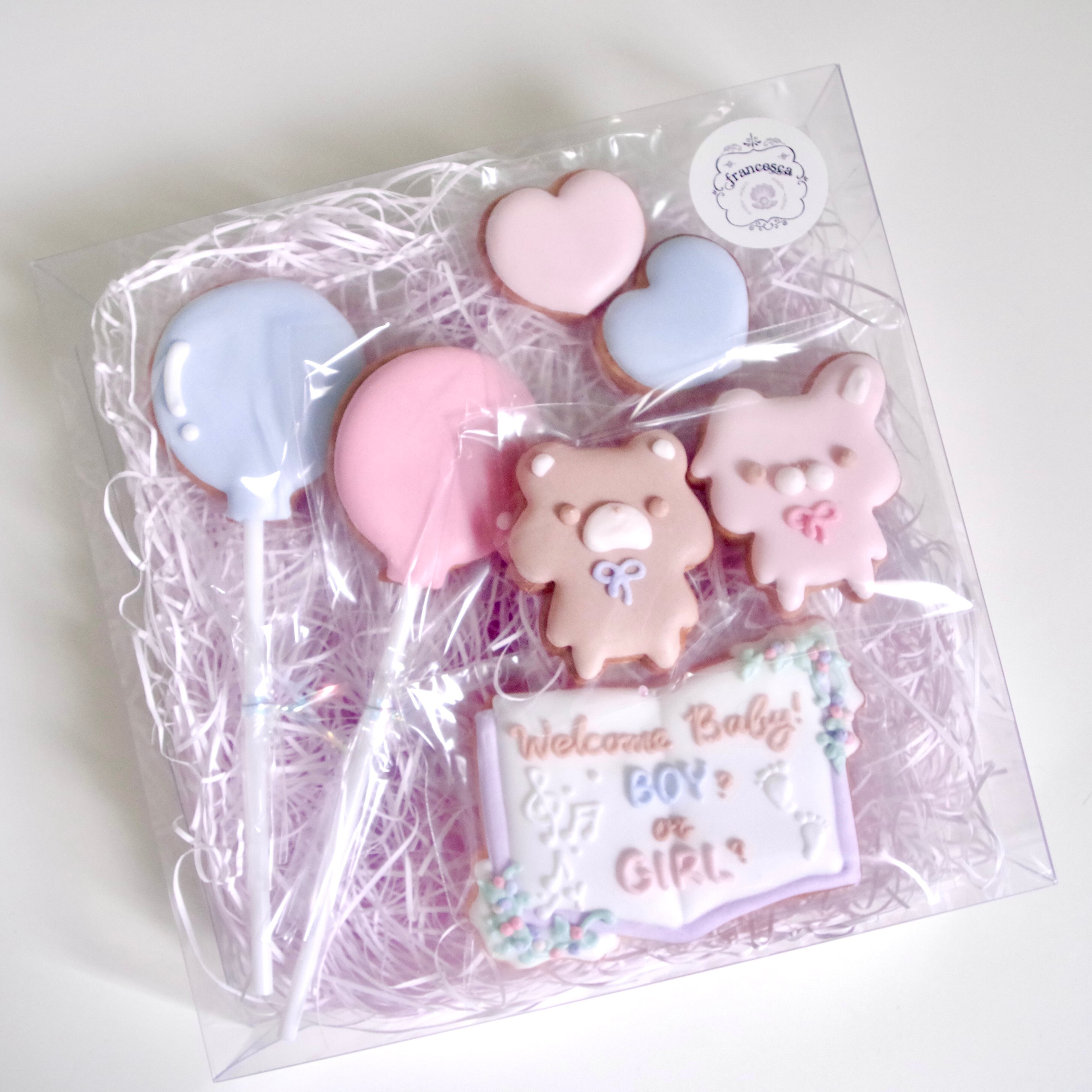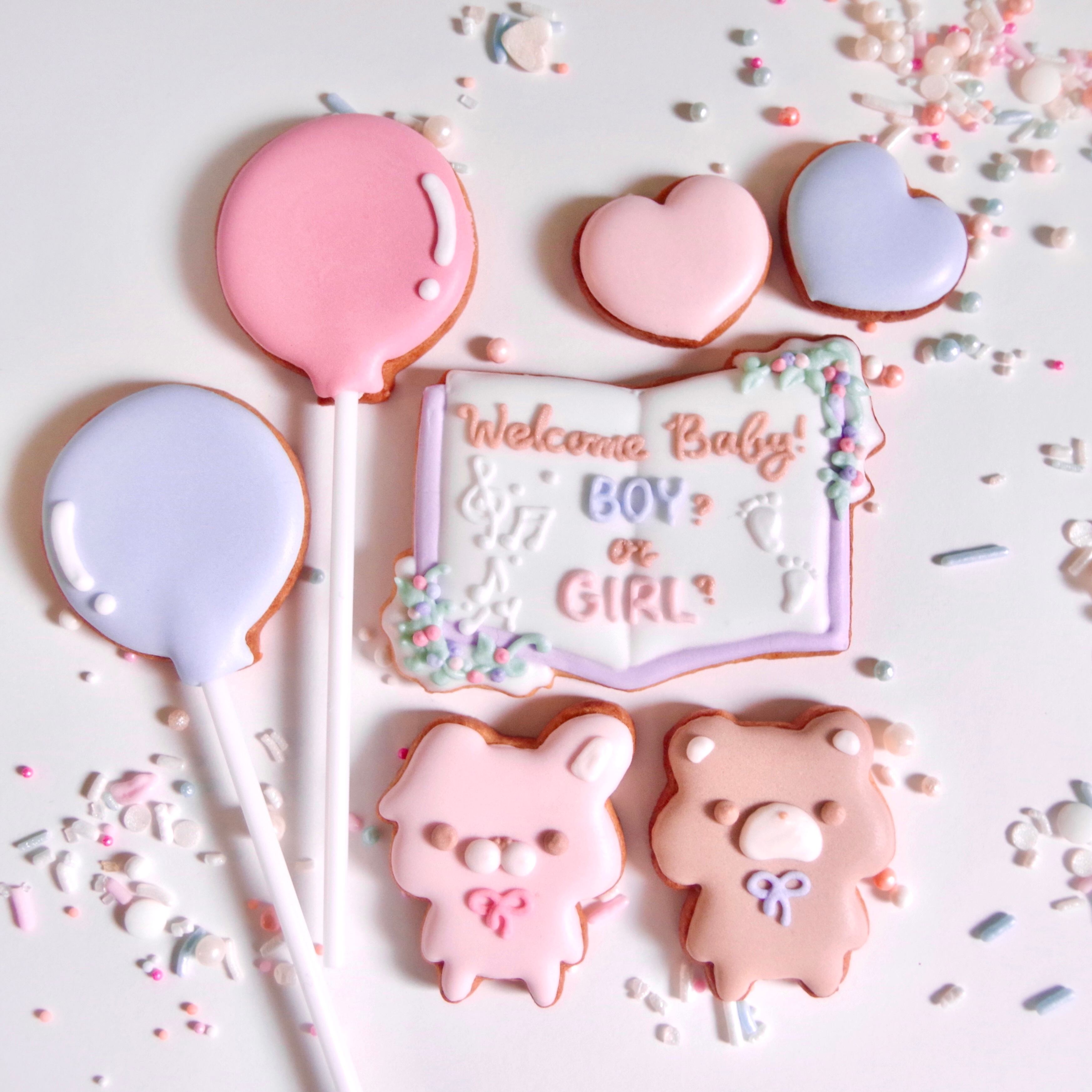 お花のブック型プレート・バルーン・うさぎ&くまのぬいぐるみ・ミニハートが入った、ジェンダーリビールにぴったりのアイシングクッキーセット。