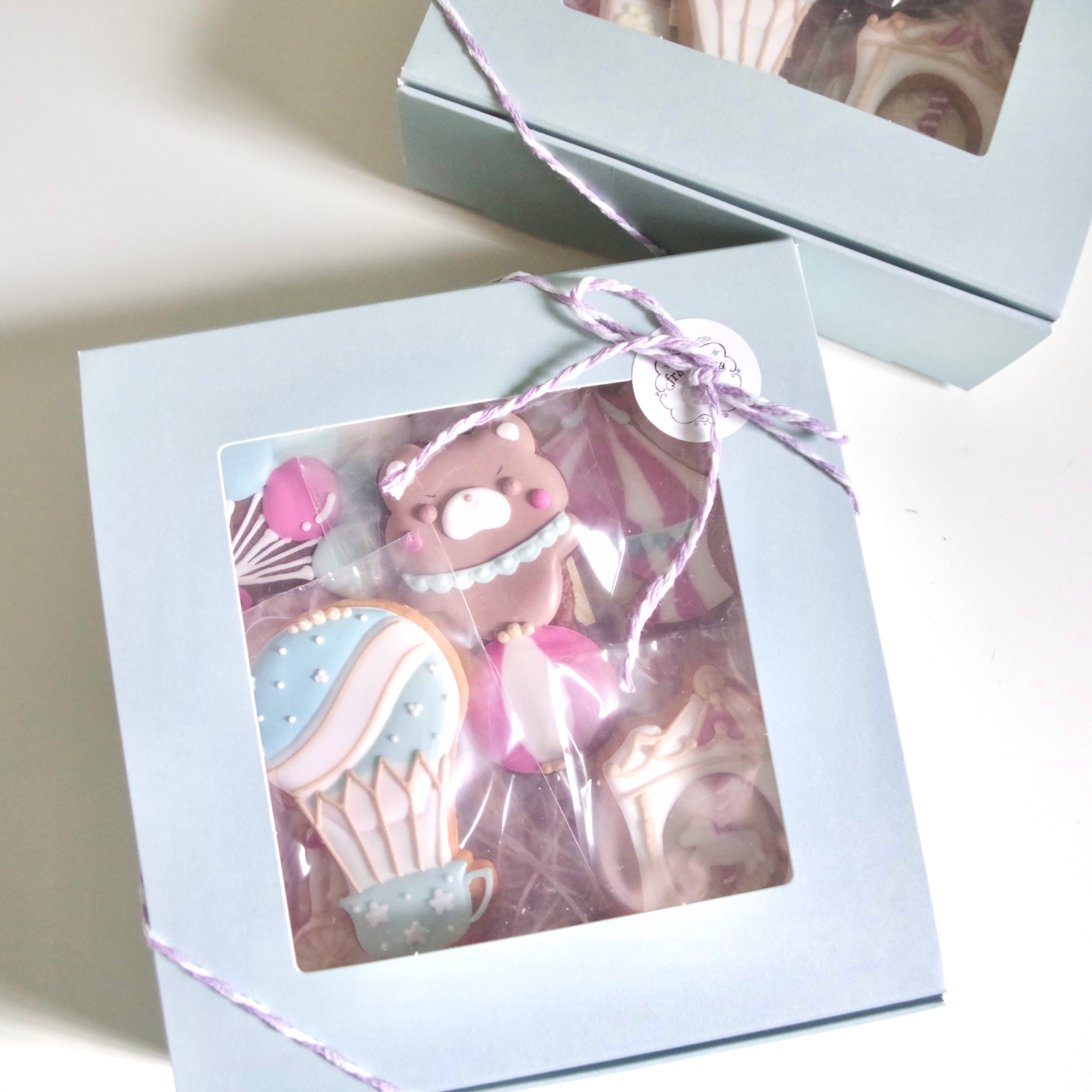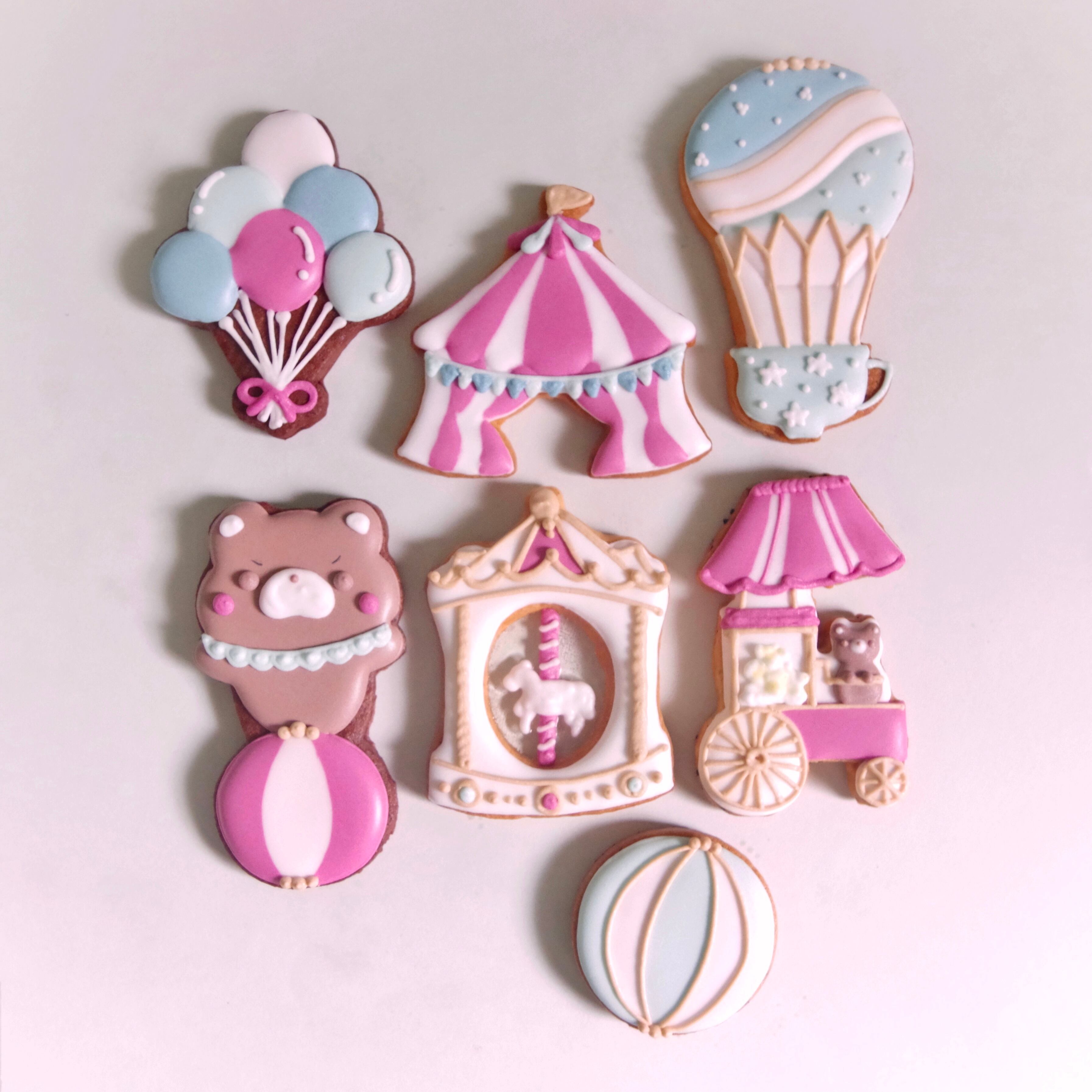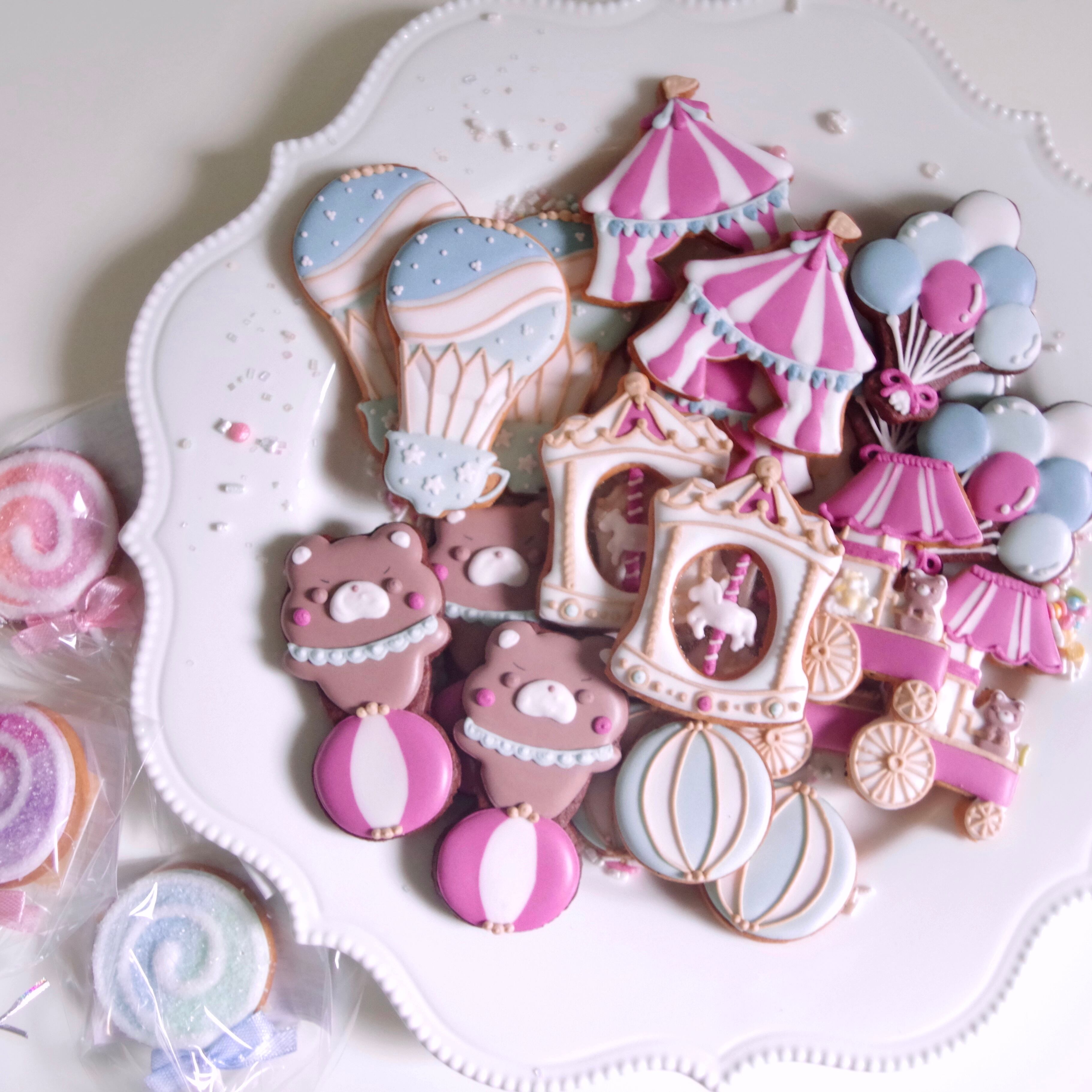 夢のような遊園地をテーマにした、ダスティパステルカラーが目を引くアイシングクッキーセット。