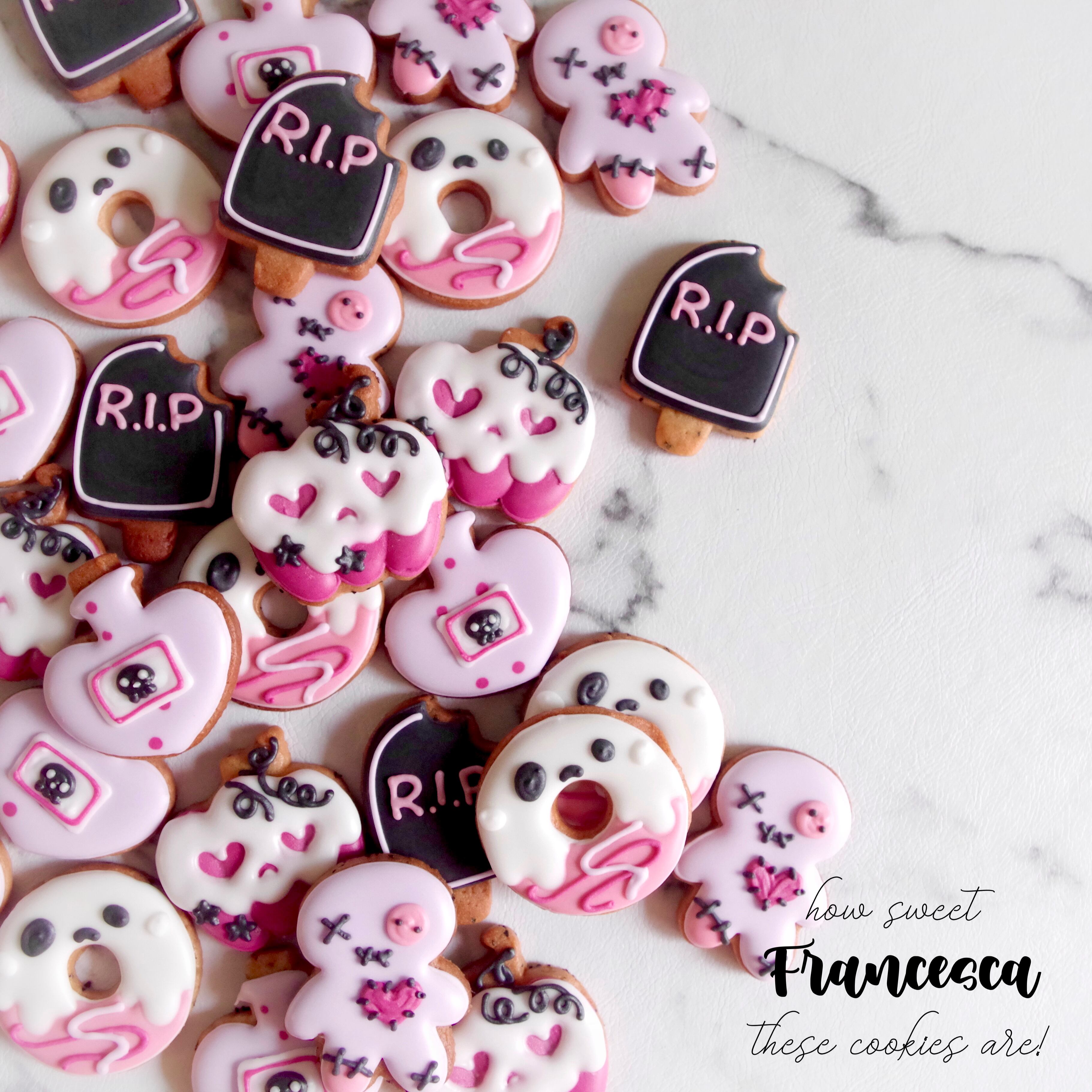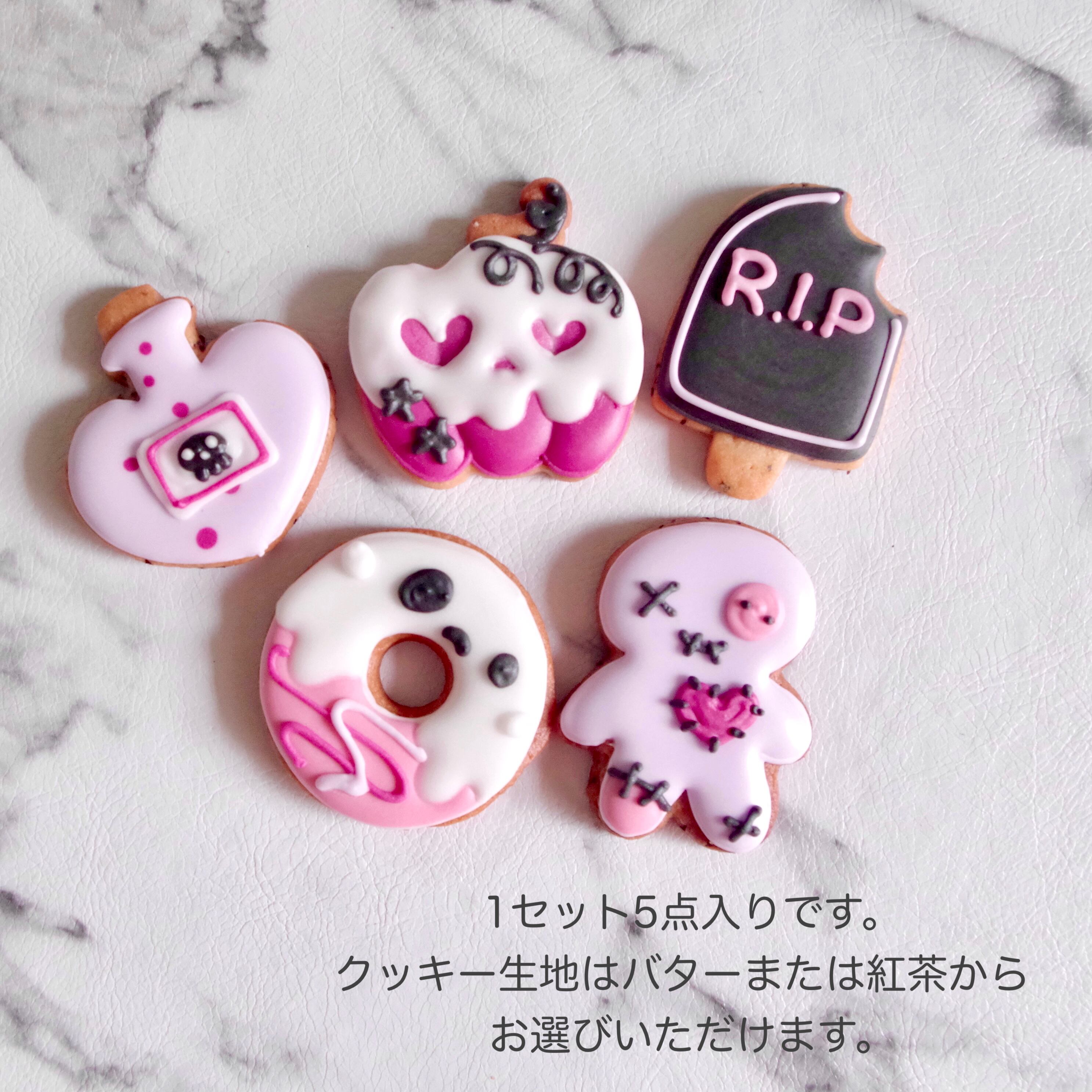 毒かぼちゃ、お墓のシャーベット、おばけドーナツ、危険なジュース、ツギハギのジンジャーブレッドの5点が入ったアイシングクッキーセットです。