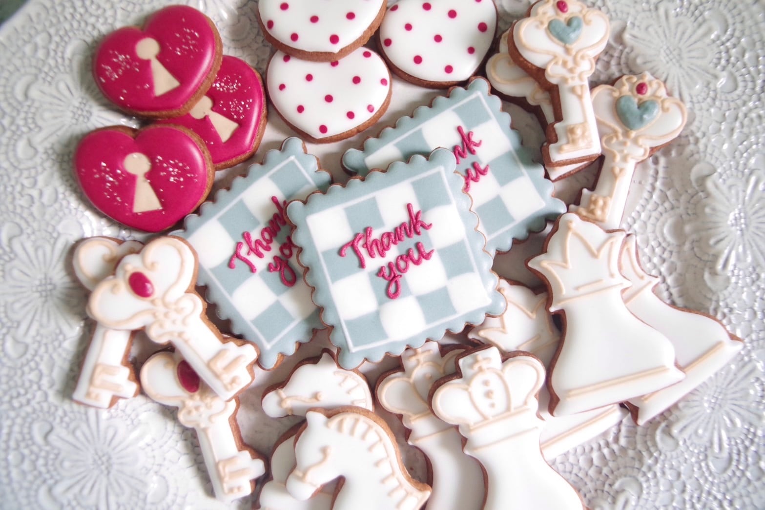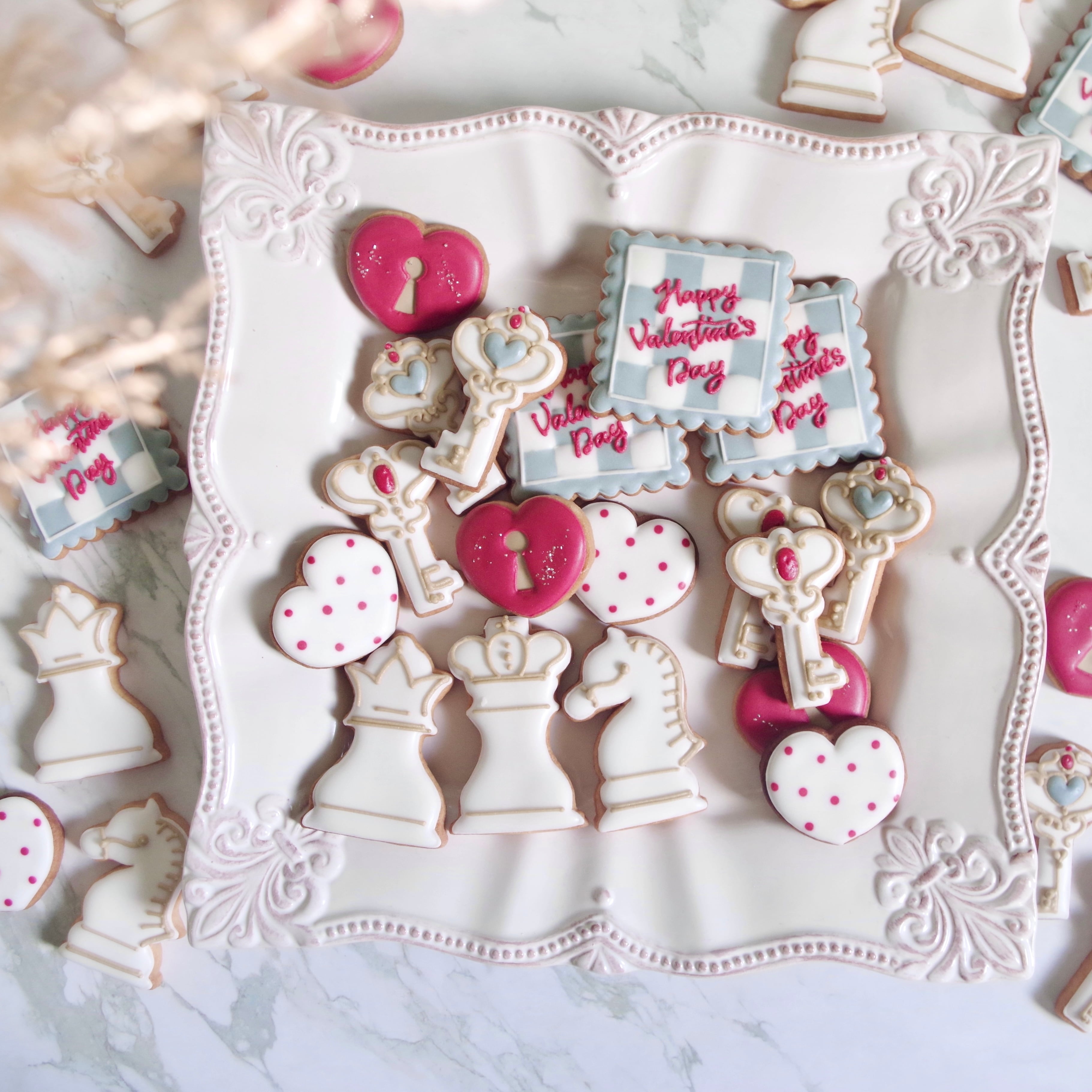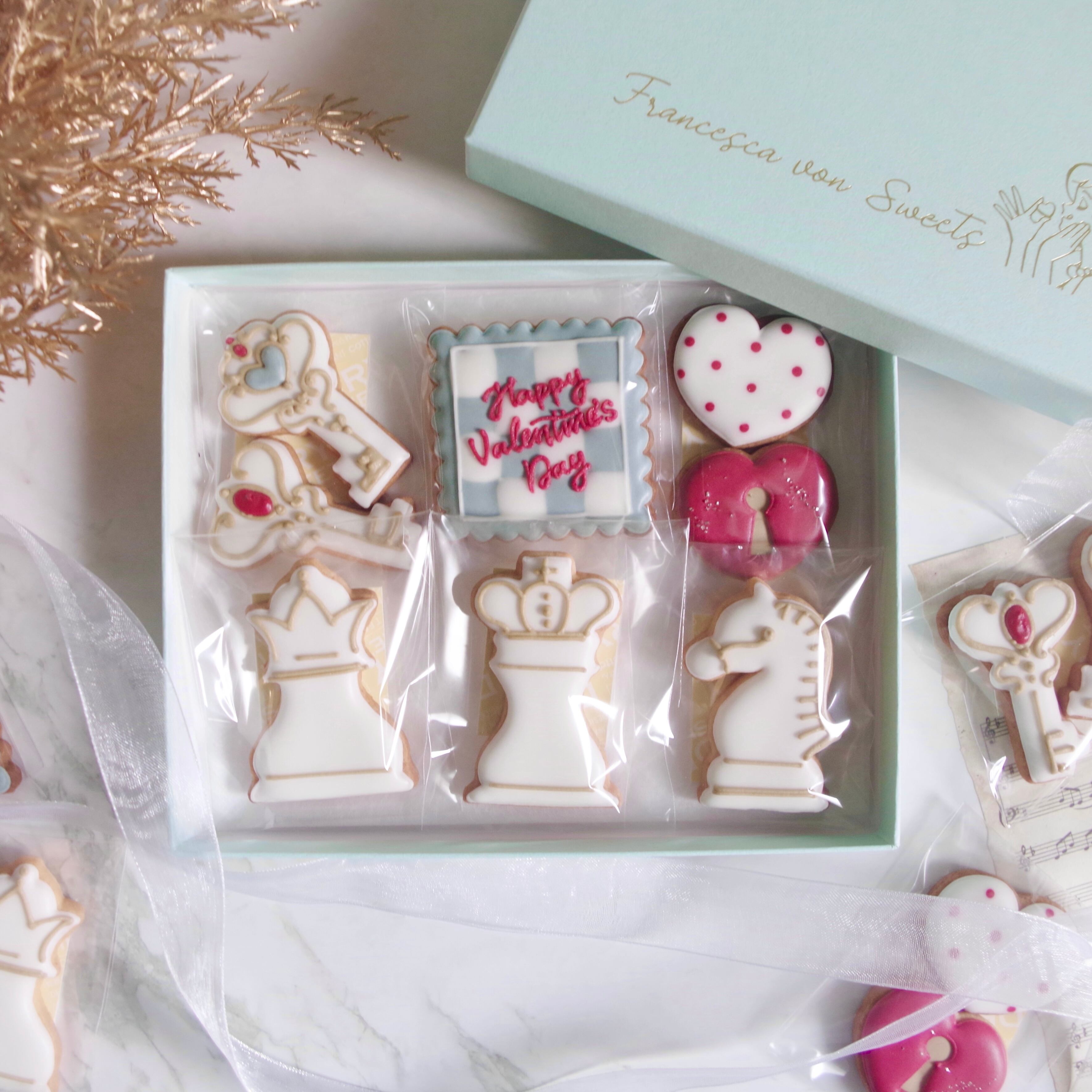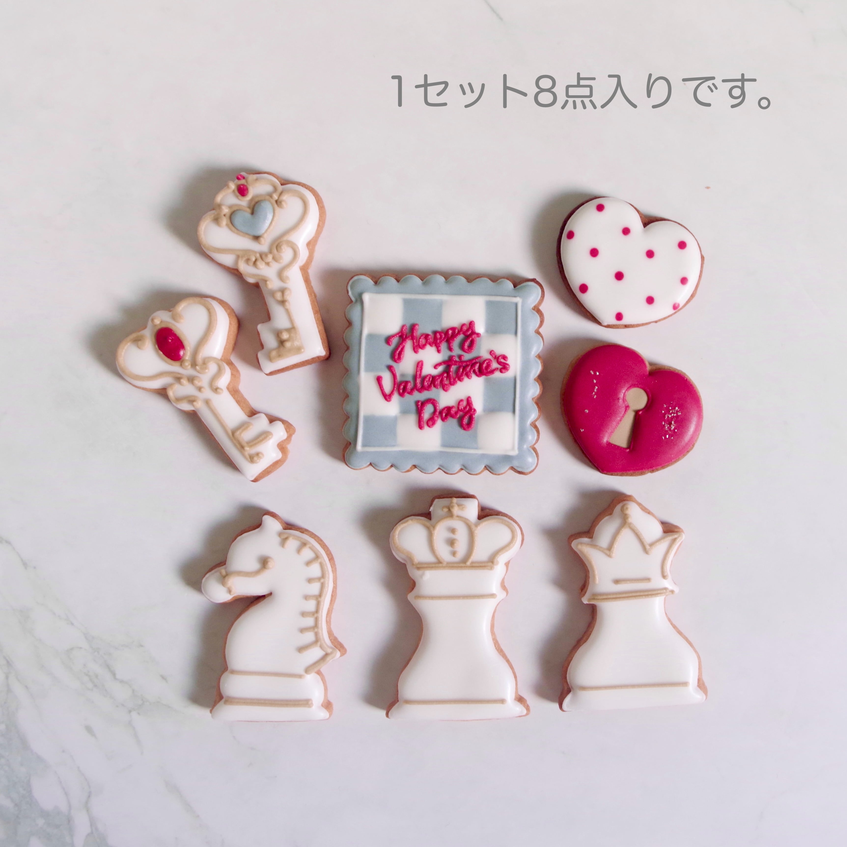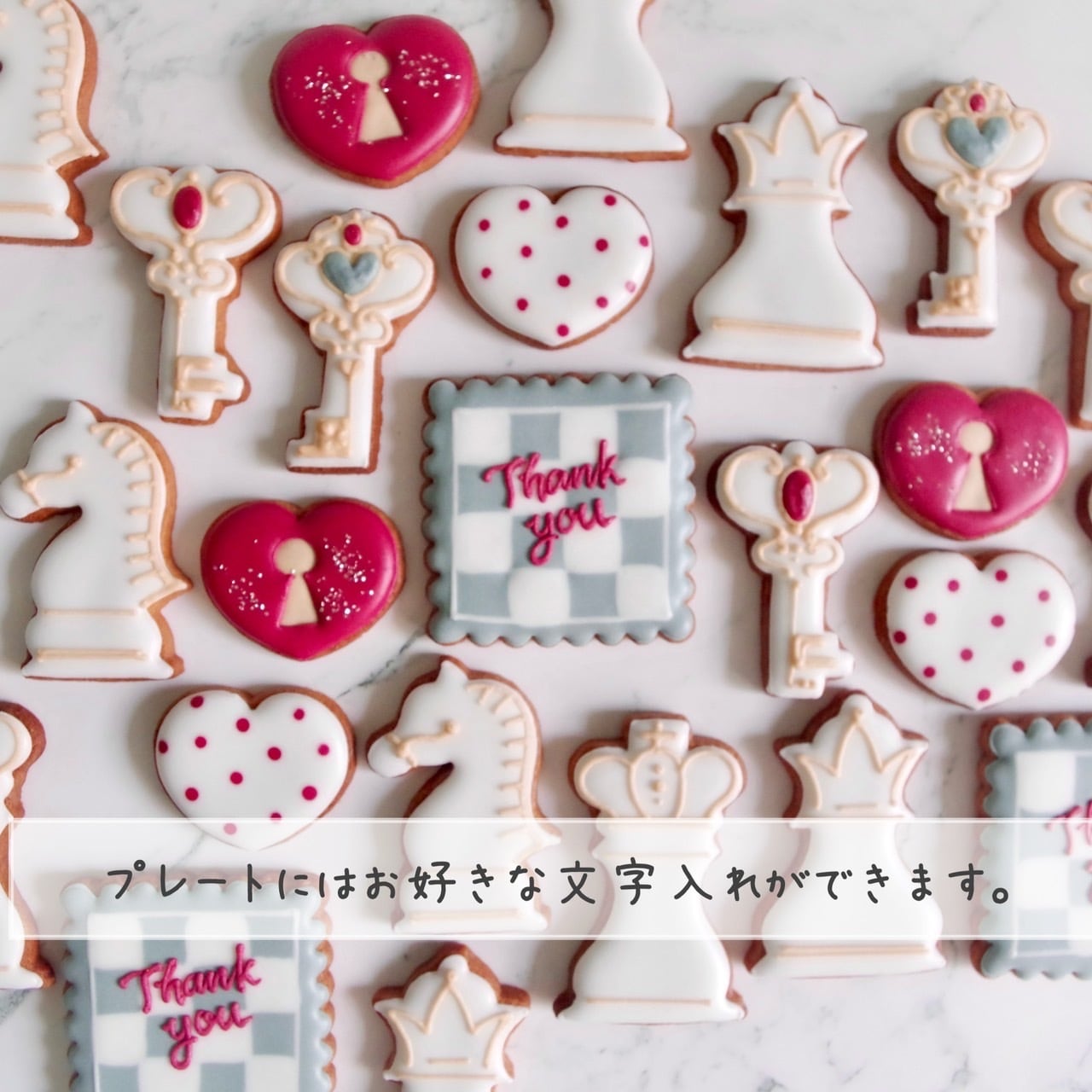 チェス盤・キング・クイーン・ナイト・鍵とハートをあしらった、文字入れのできるアイシングクッキーセット。