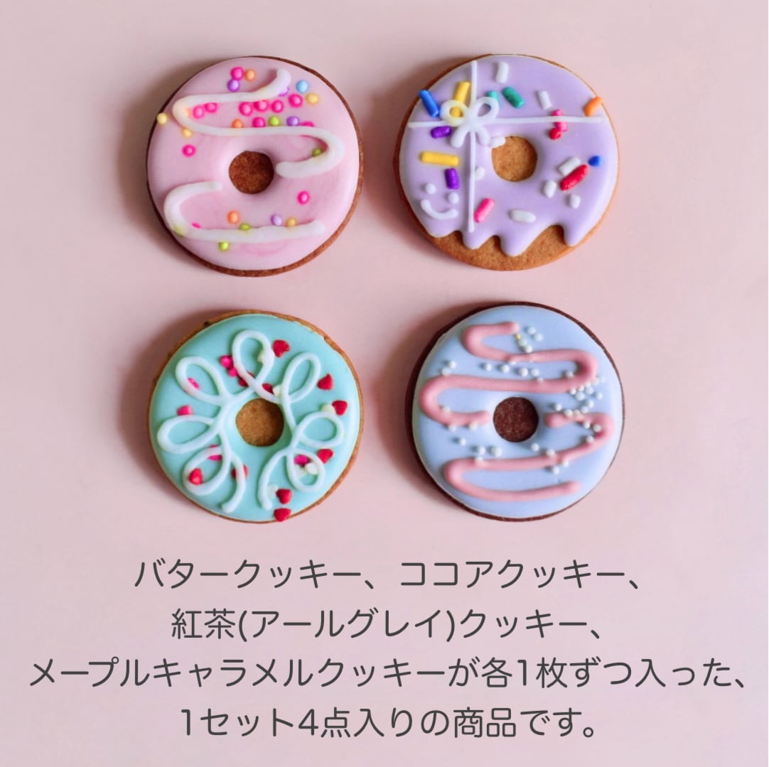 クッキー生地はバタークッキー、ココアクッキー、紅茶(アールグレイ)クッキー、メープルキャラメルクッキーが各1枚ずつ、合計4枚が入ったアソートセットです。