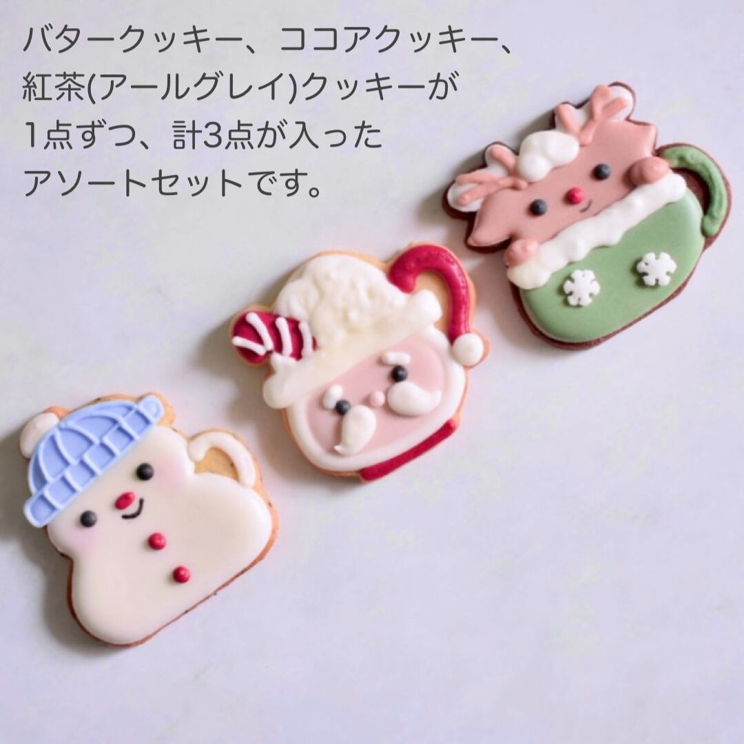 クッキー生地はバタークッキー・ココアクッキー・紅茶(アールグレイ)クッキーが各1点ずつ入った3種アソートになっています。