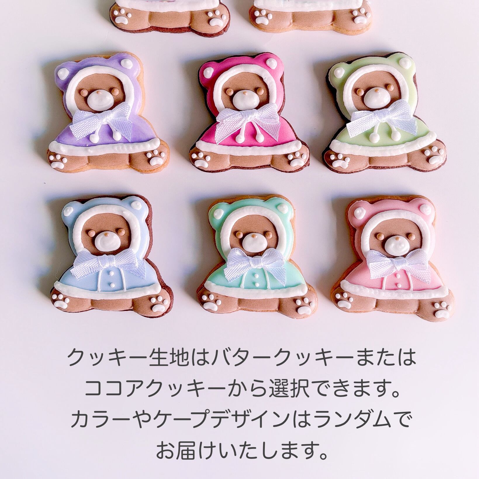 クッキー生地はバタークッキー、ココアクッキーからお選び頂けます。カラーはランダムとなっています。